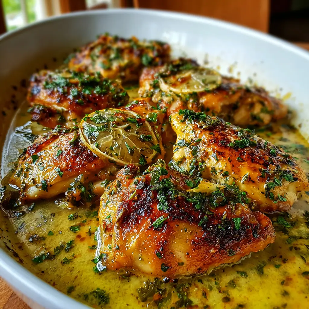 - Place chicken thighs in a baking dish and pour the lemon butter mixture over them.