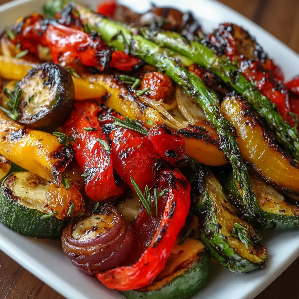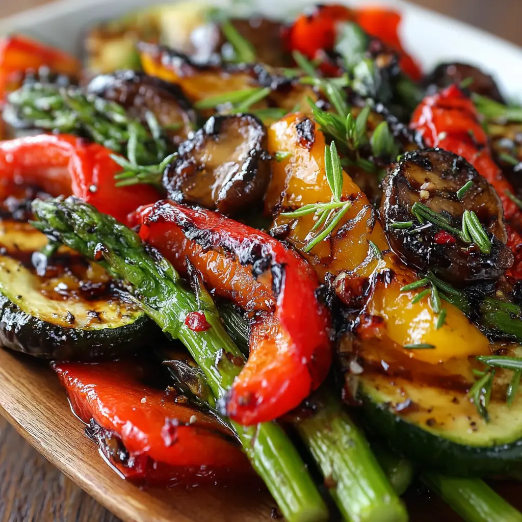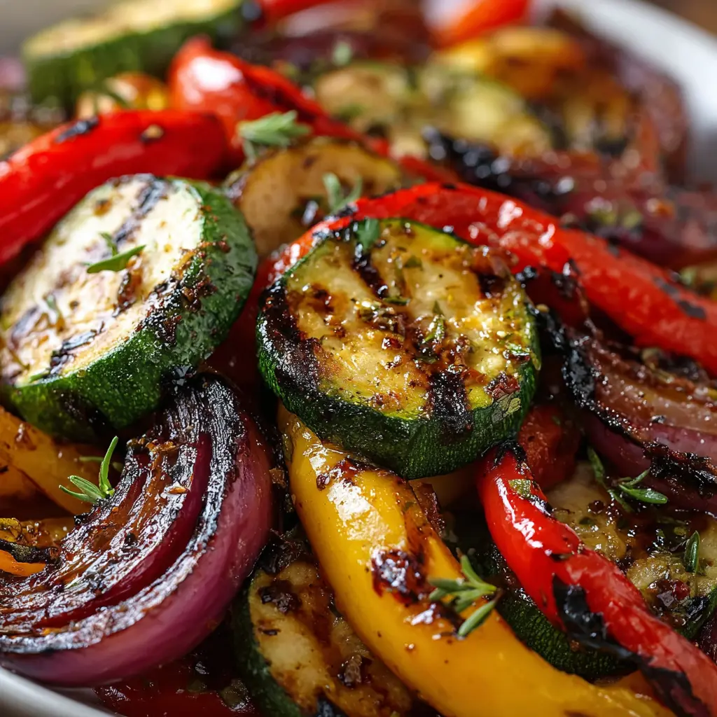 A delicious side dish perfect for summer barbecues featuring vibrant grilled vegetables marinated in a balsamic dressing.