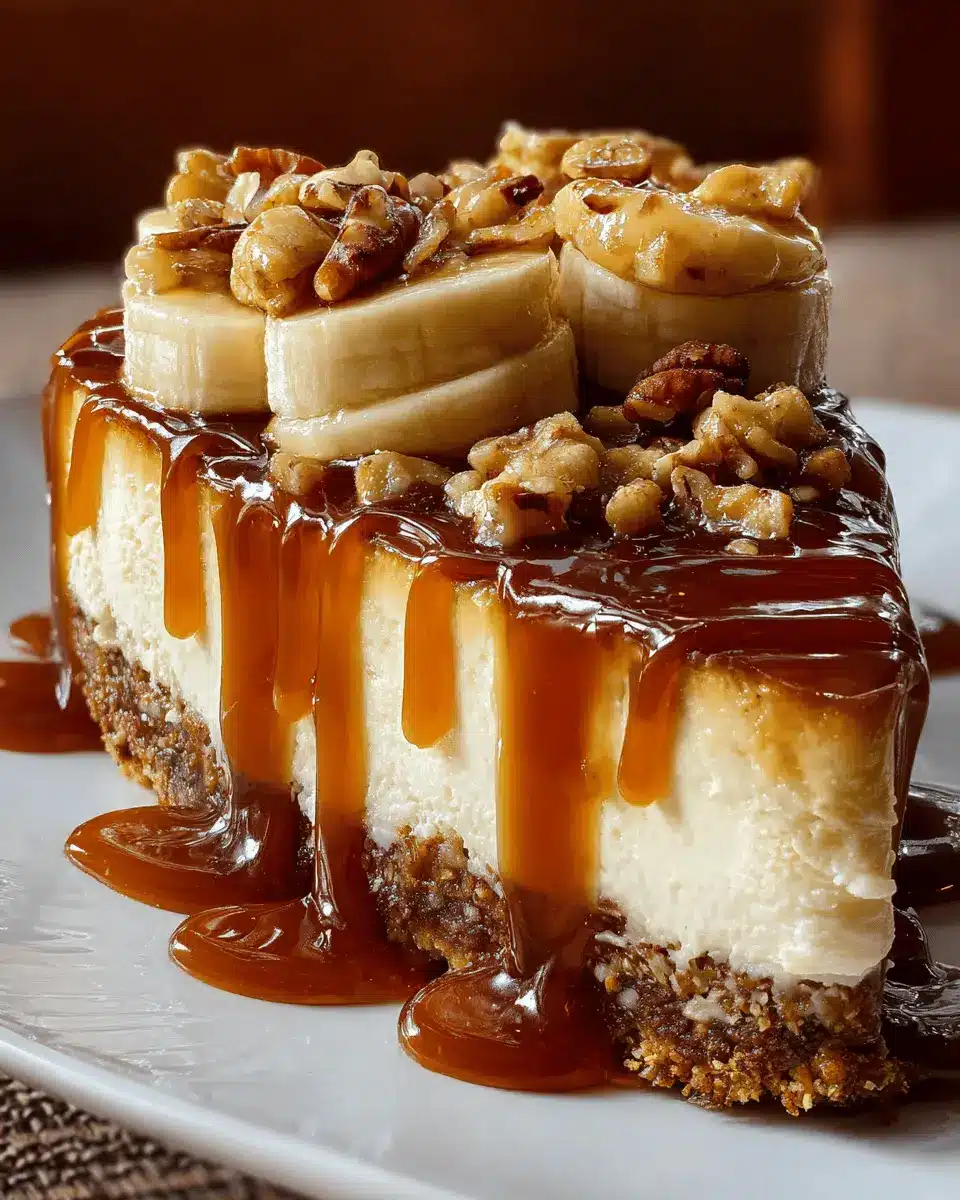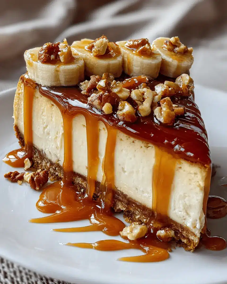 A creamy and decadent cheesecake topped with caramel, nuts, and fresh bananas, perfect for any special occasion.