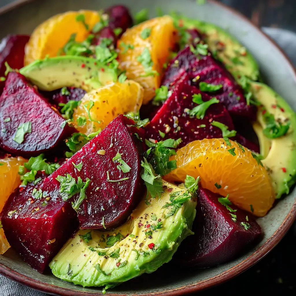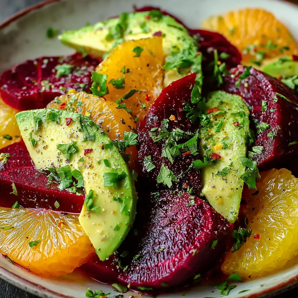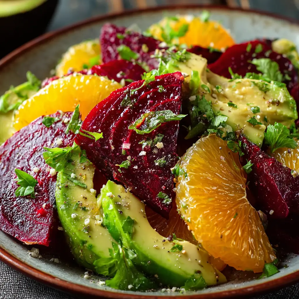 A light and refreshing salad featuring the vibrant flavors of beets, creamy avocado, and sweet oranges, perfect for any occasion.