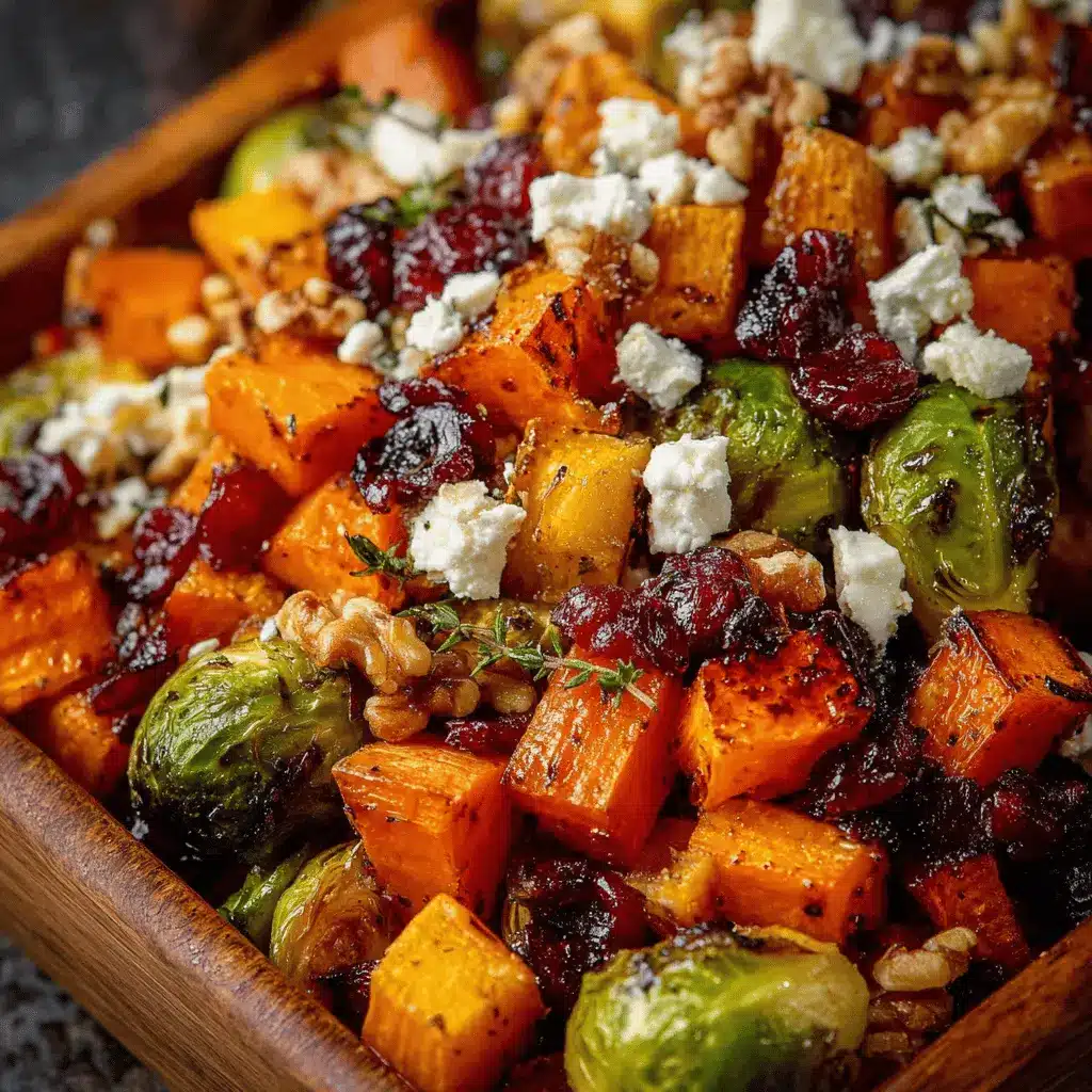 A delicious and vibrant dish combining caramelized butternut squash, sweet potatoes, and feta cheese, topped with a cranberry-honey glaze, perfect for any meal.