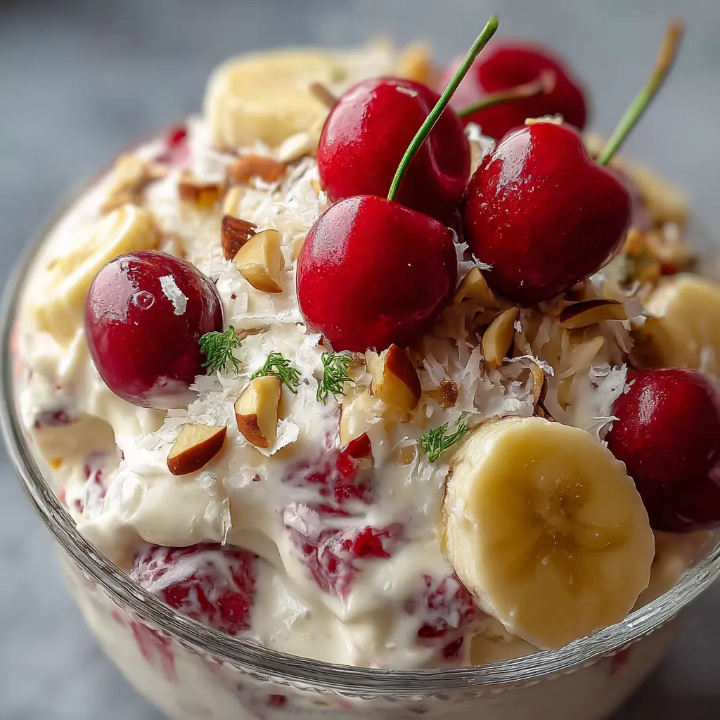 A delightful and refreshing dessert that combines the sweetness of cherries and bananas with a creamy dressing, perfect for summer gatherings.