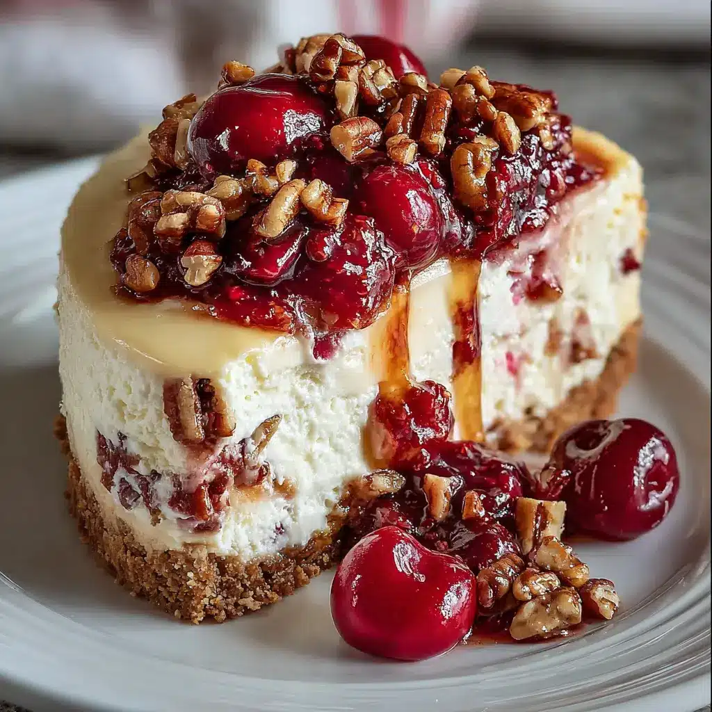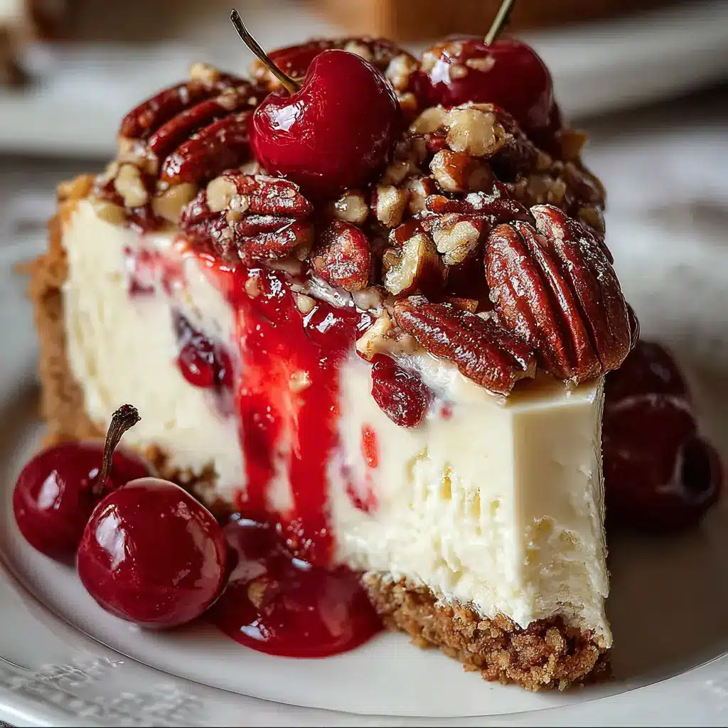 A rich and creamy dessert featuring layers of cheesecake, cherries, and pecans.