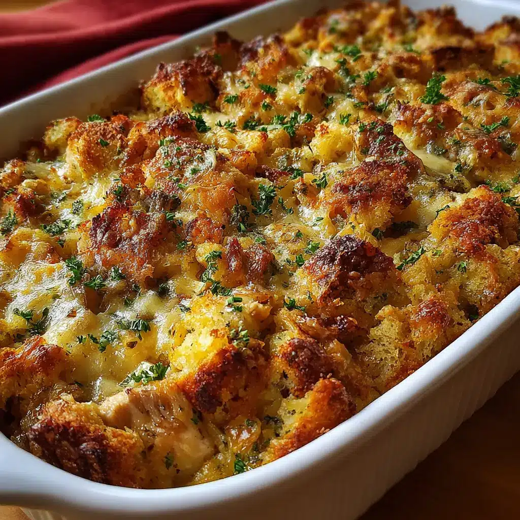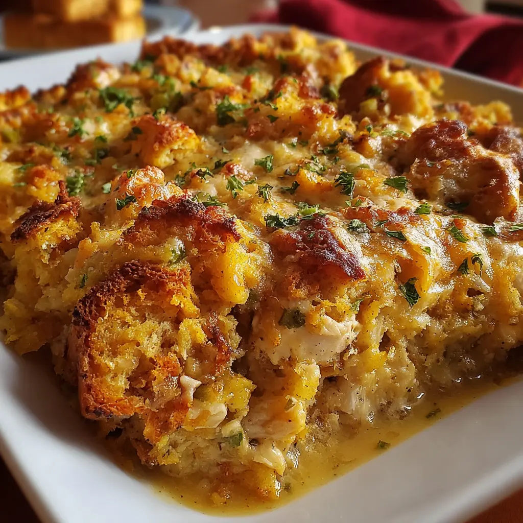 A delicious and comforting chicken and dressing casserole perfect for any day of the week.
