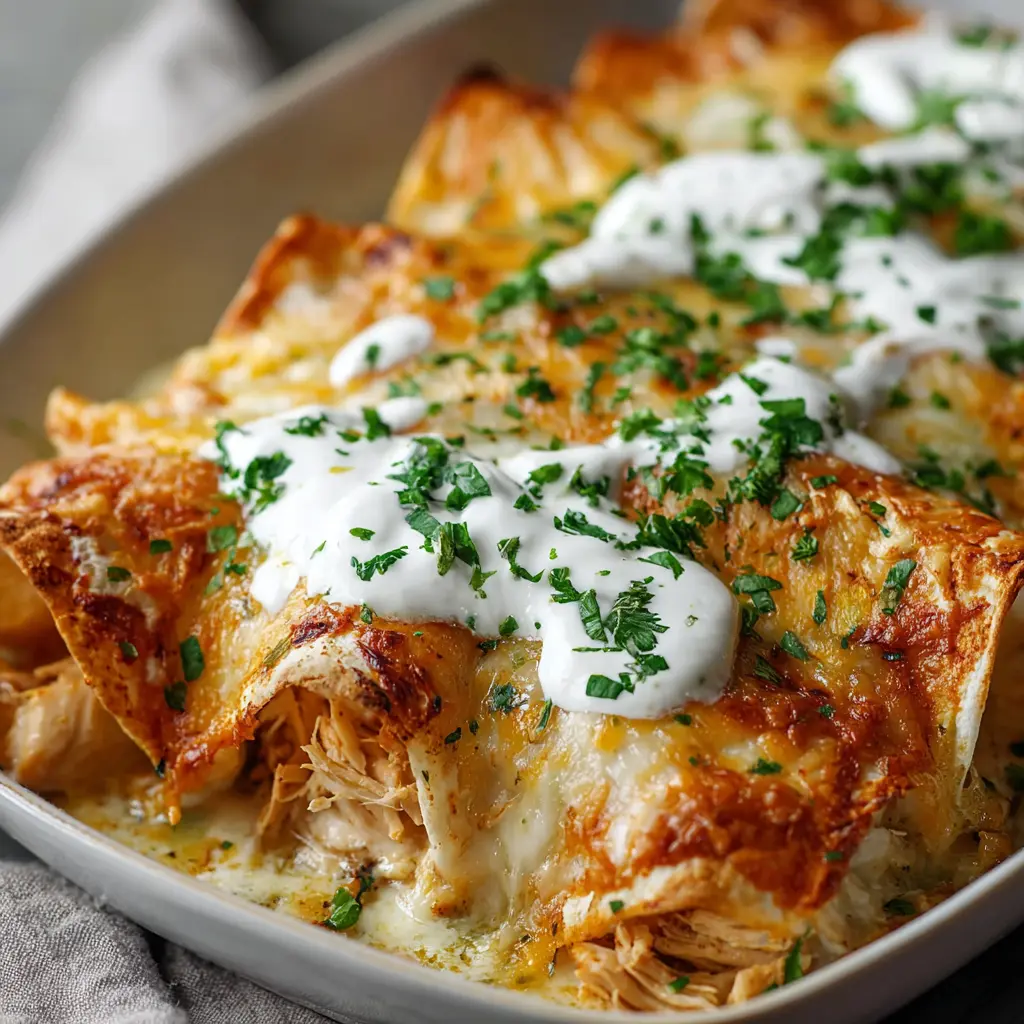 Indulge in the creamy and cheesy goodness of chicken enchiladas topped with a savory sour cream white sauce.