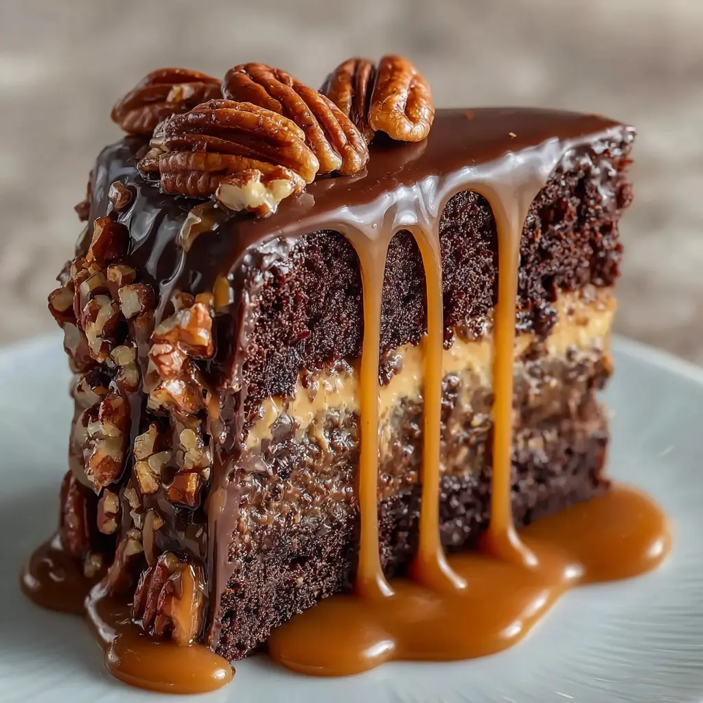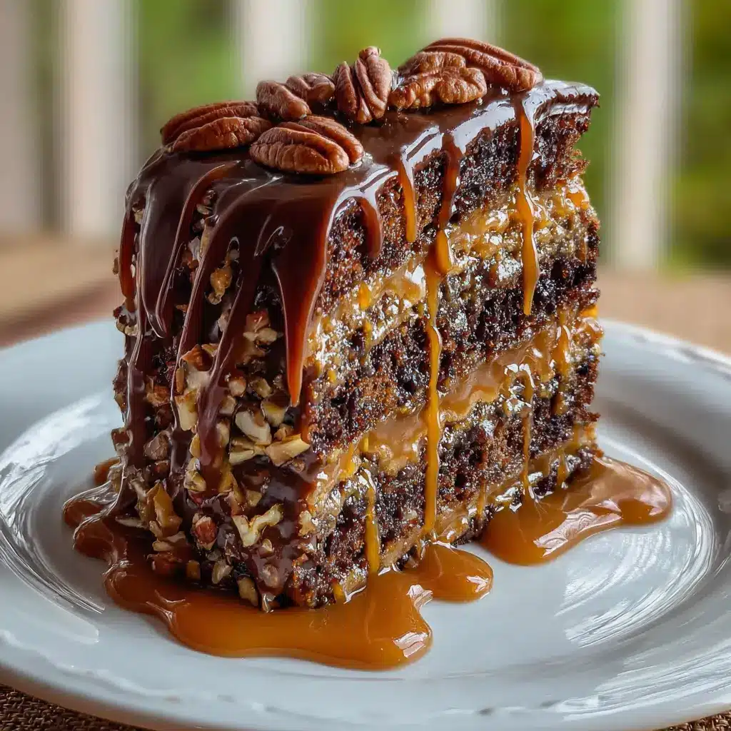 This Chocolate Caramel Pecan Cake is a decadent dessert featuring layers of rich chocolate, smooth caramel, and crunchy pecans.