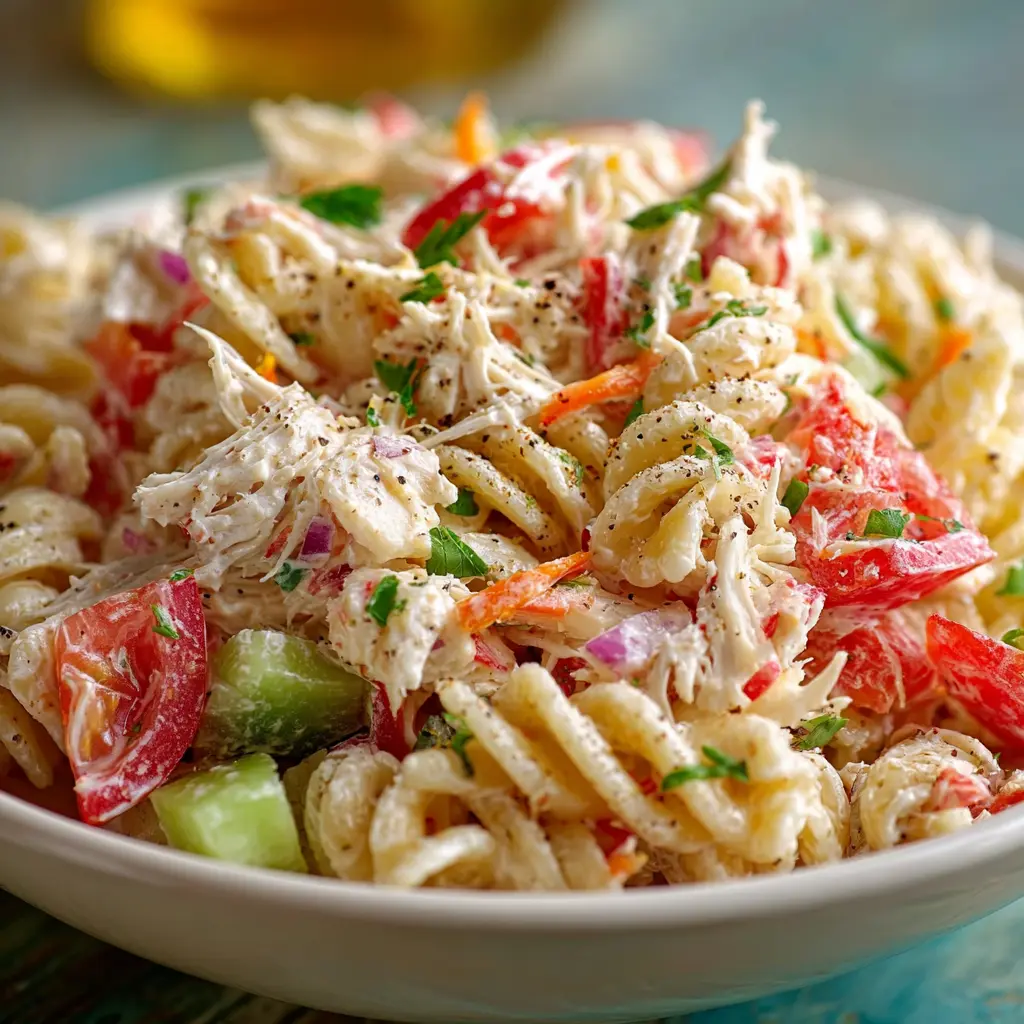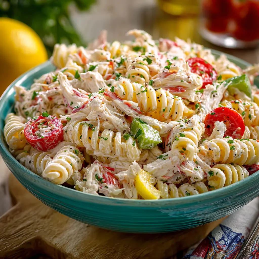 Enjoy a delightful crab pasta salad perfect for summer gatherings. This recipe combines fresh ingredients and bold flavors.