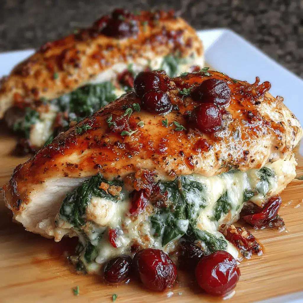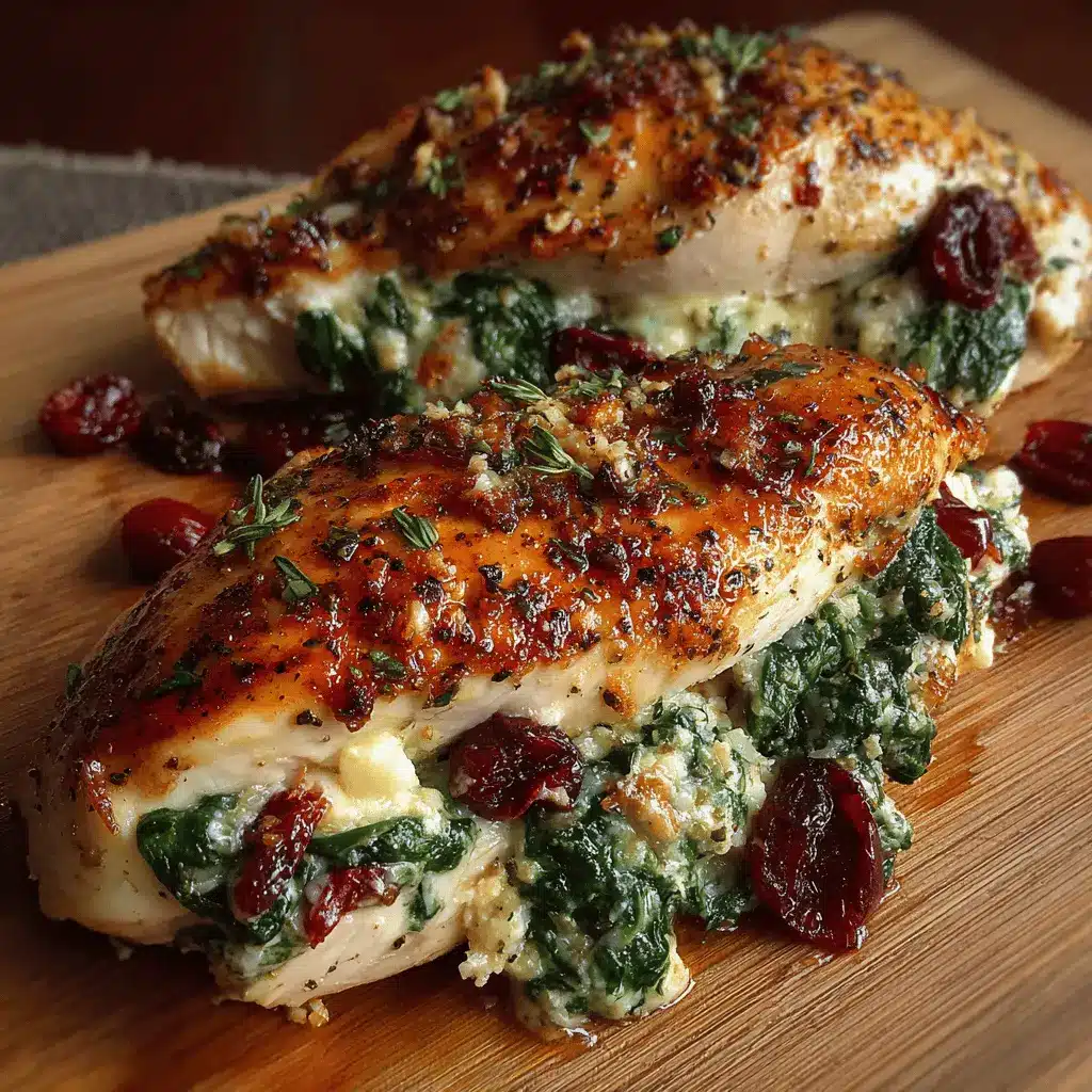Cranberry & Spinach Stuffed Chicken Breasts with Swiss Cheese is a delightful balance of flavors, combining savory chicken, tart cranberries, and nutty Swiss cheese. This dish not only pleases the palate but also adds a pop of color to your dinner plate.