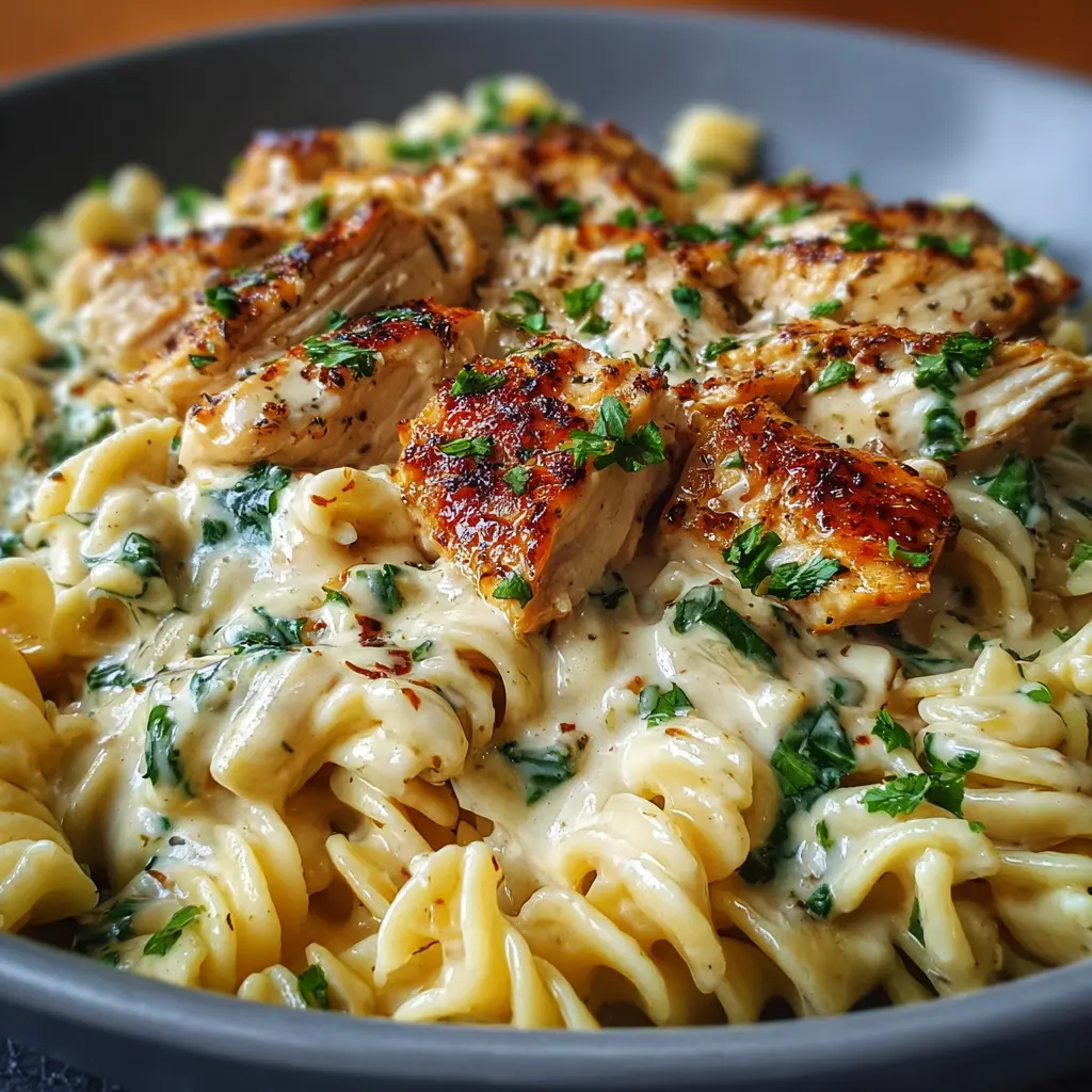 For a pop of color and a nutrient boost, consider mixing in some fresh spinach or kale. Toss in a handful right at the end, allowing it to wilt gently in the warmth of the dish. Not only does it add a lovely flavor, but it also enhances the nutritional profile, making your creamy cheesy chicken pasta even more wholesome.