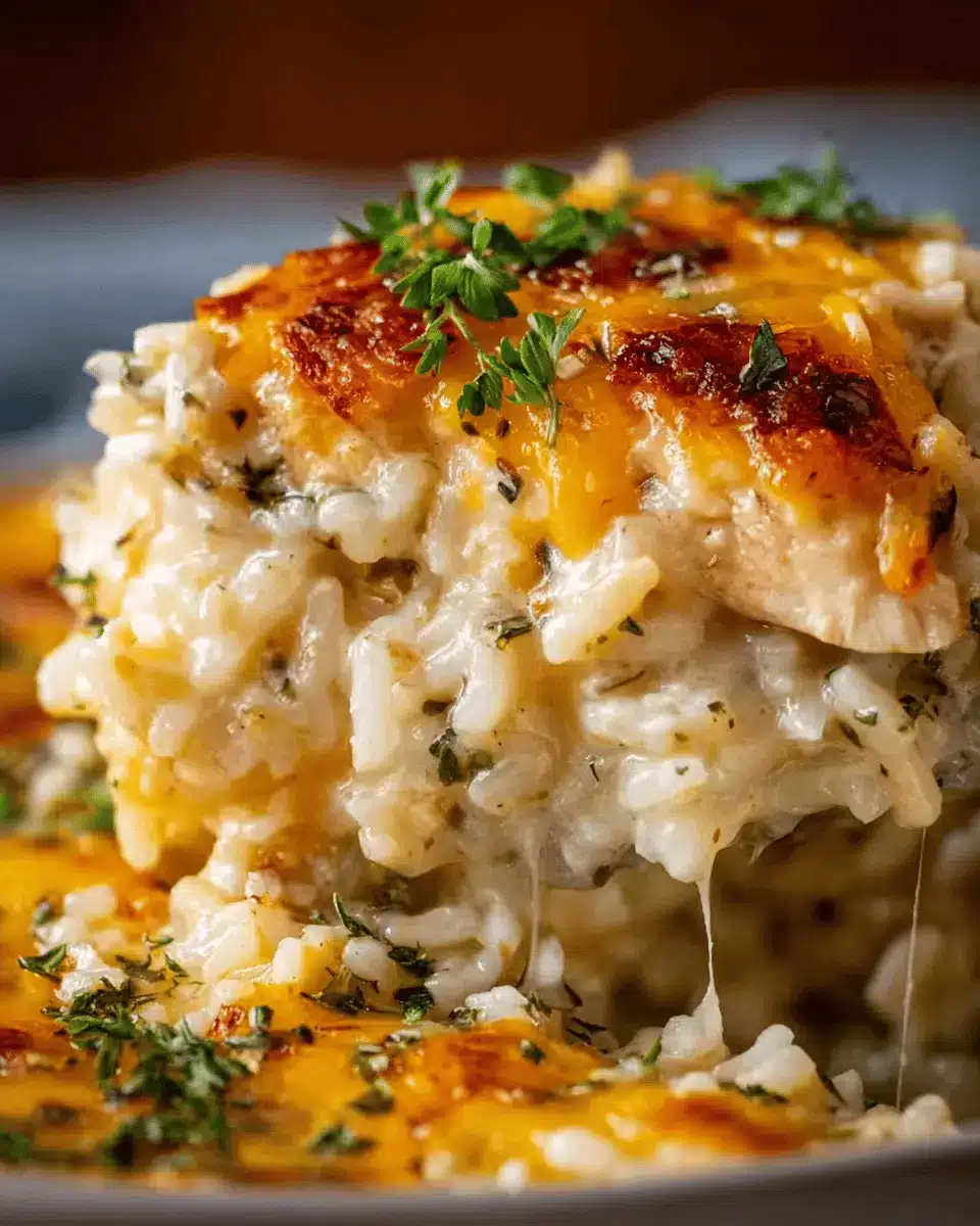 A comforting and indulgent dish that combines tender chicken, creamy rice, and flavorful Italian herbs, all topped with melty Colby Jack cheese.
