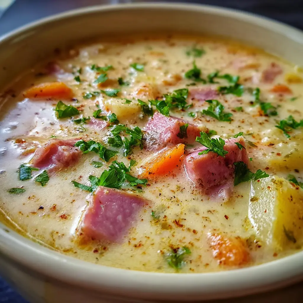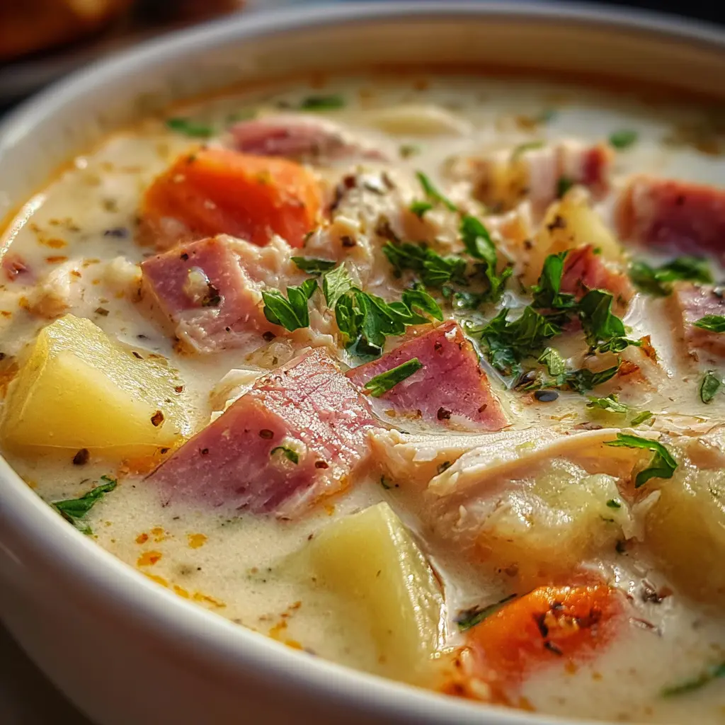 A warm and comforting bowl of creamy chicken ham and potato soup, perfect for cozy evenings.