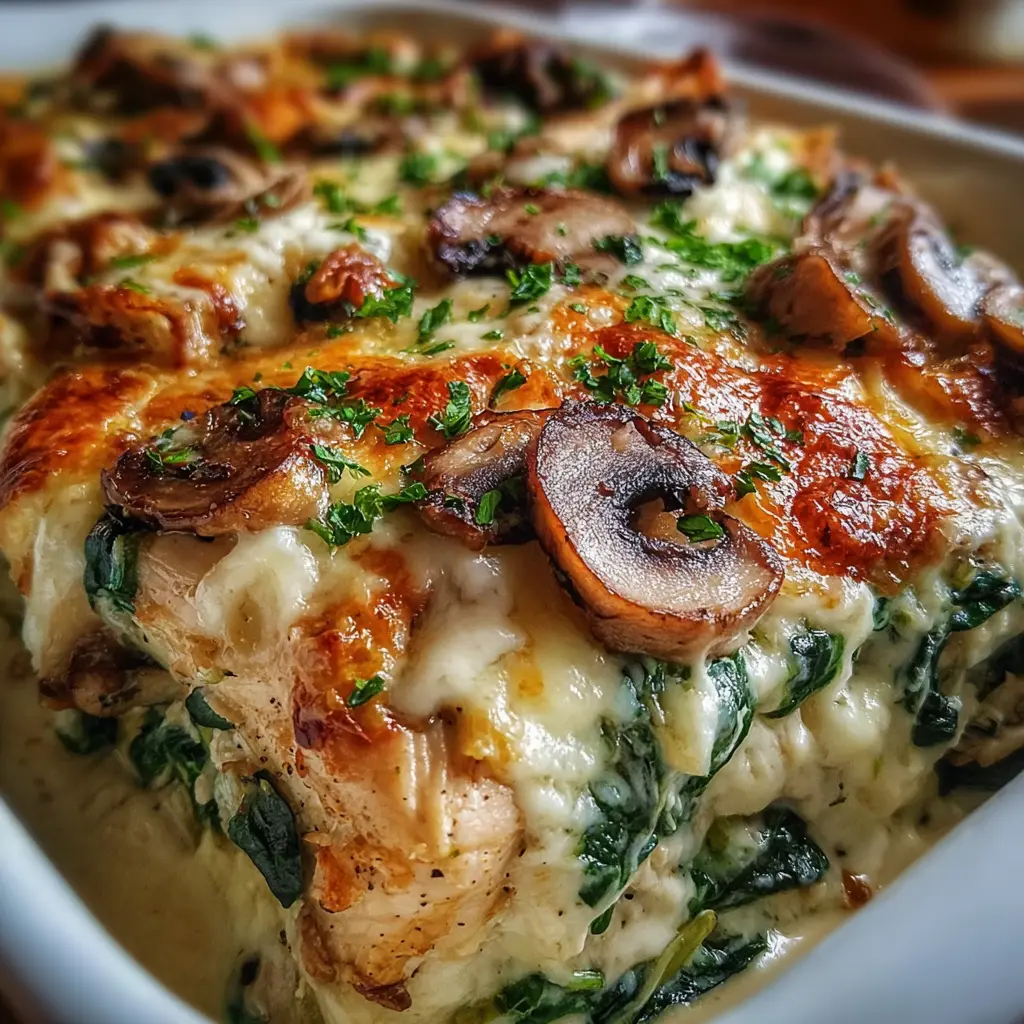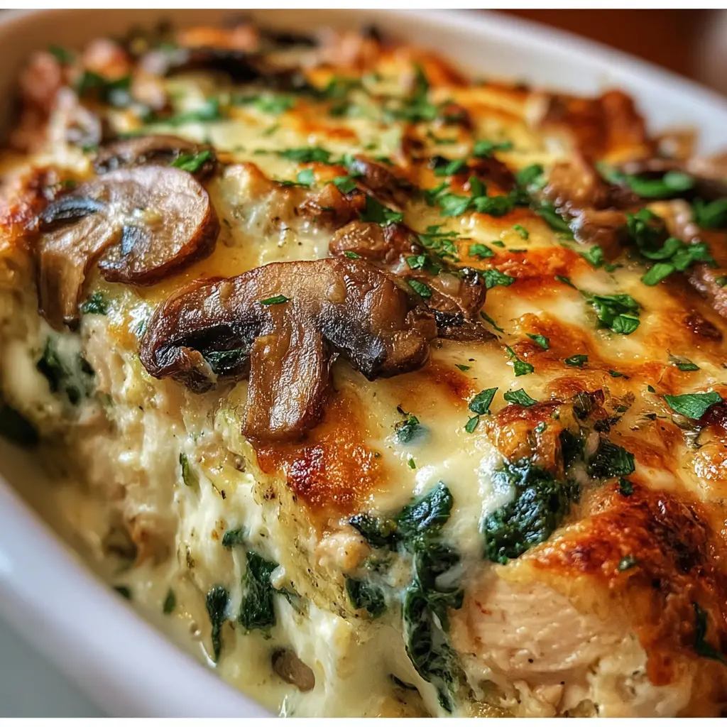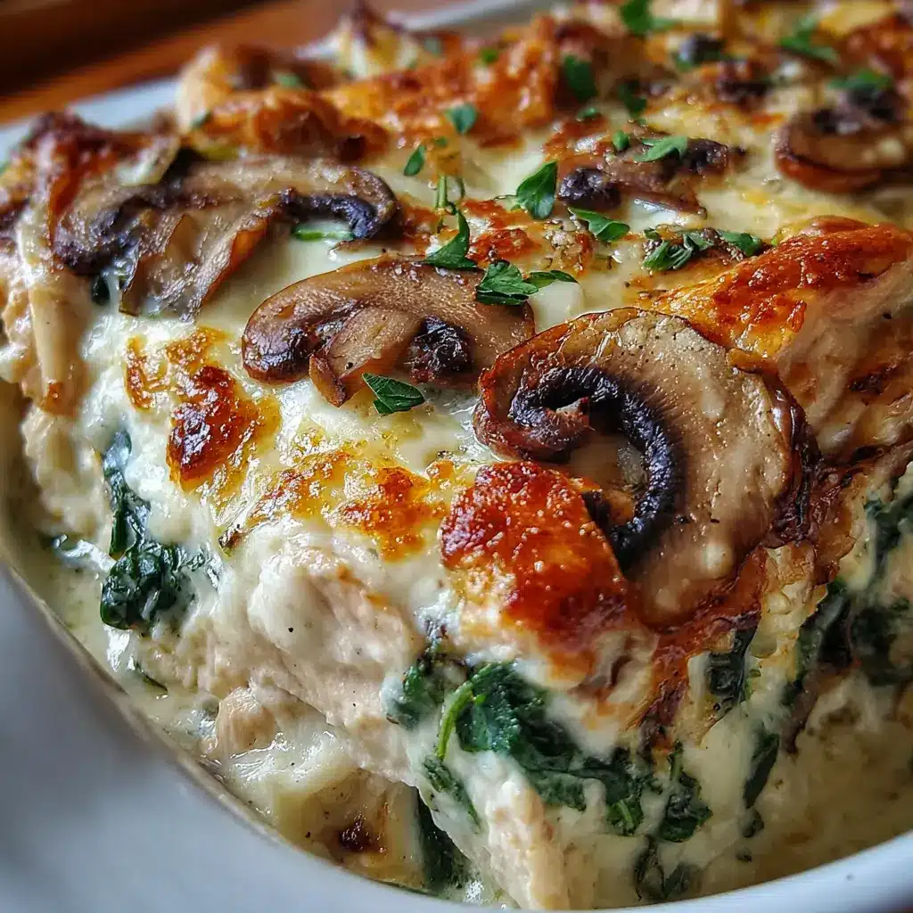 A delicious and comforting creamy cottage cheese chicken casserole with mushrooms and spinach.