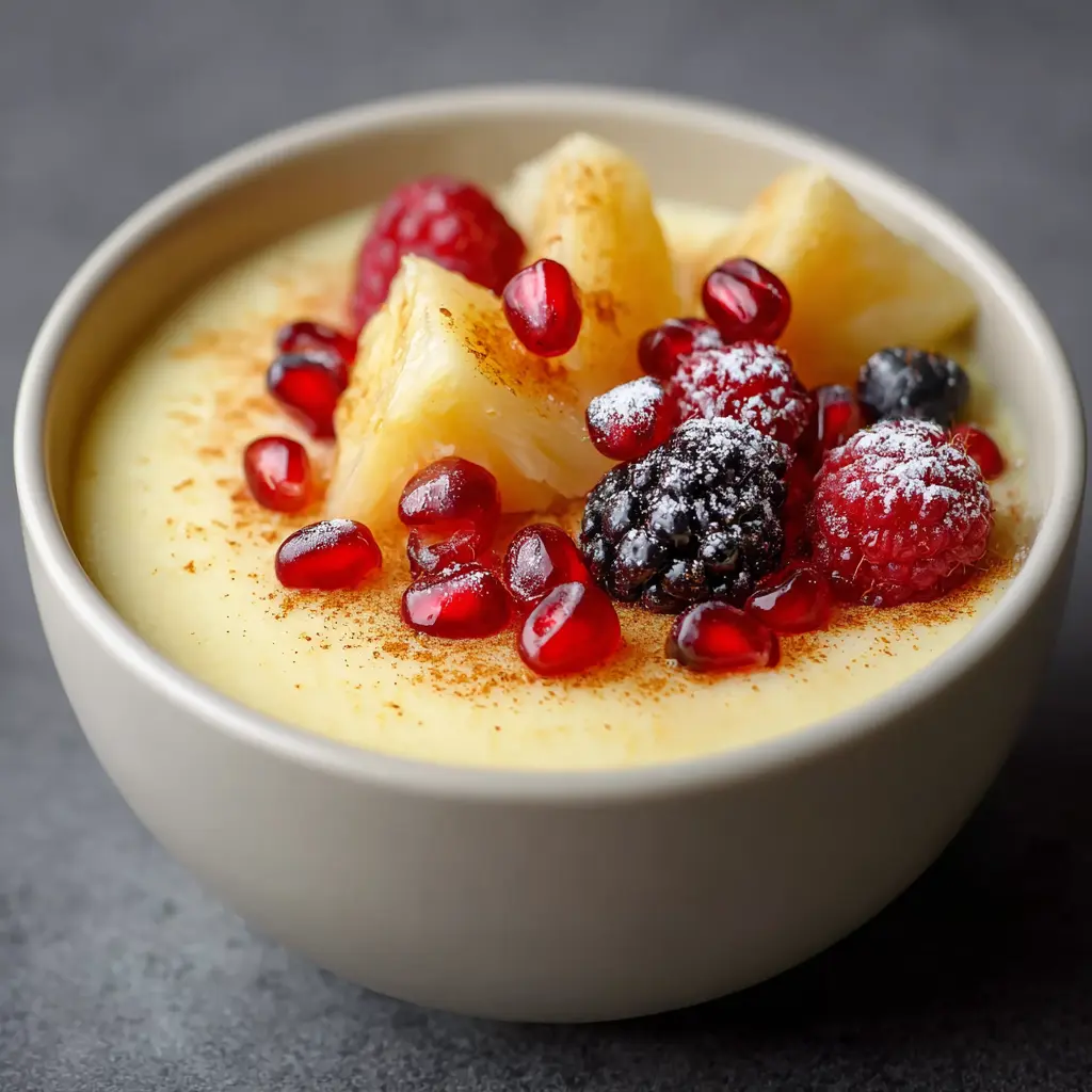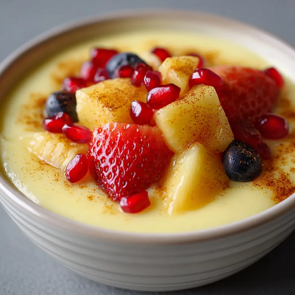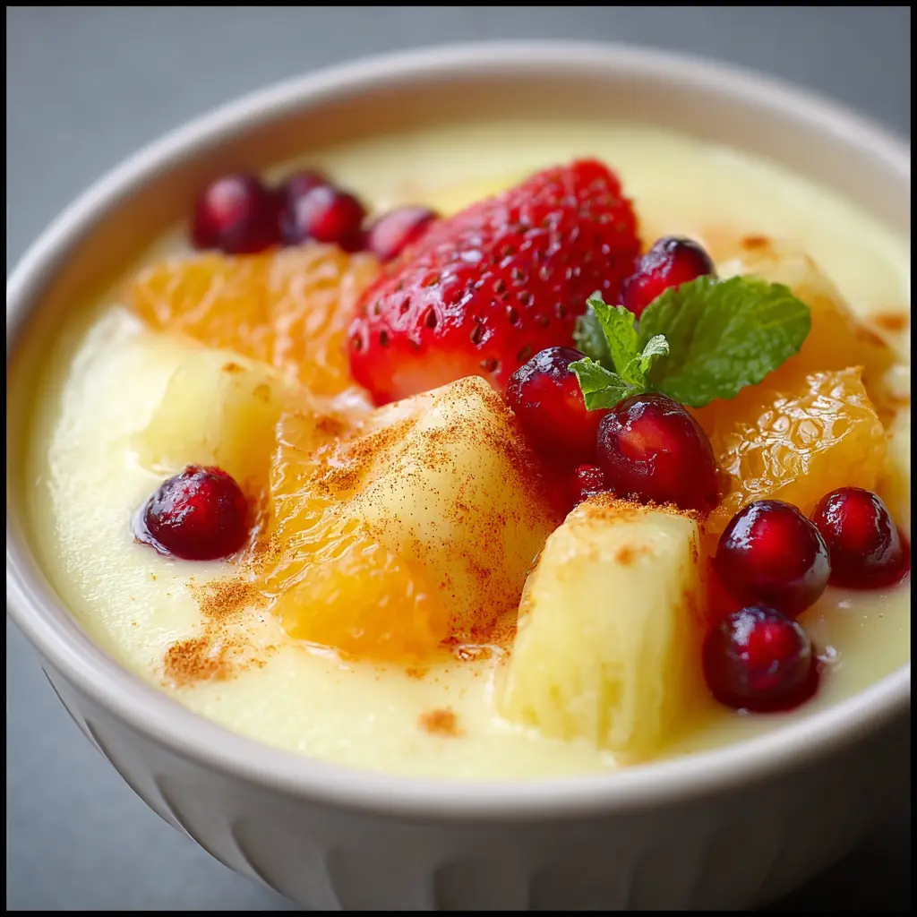 A delightful creamy fruit custard bowl that combines rich flavors and vibrant fruits, perfect for dessert lovers.