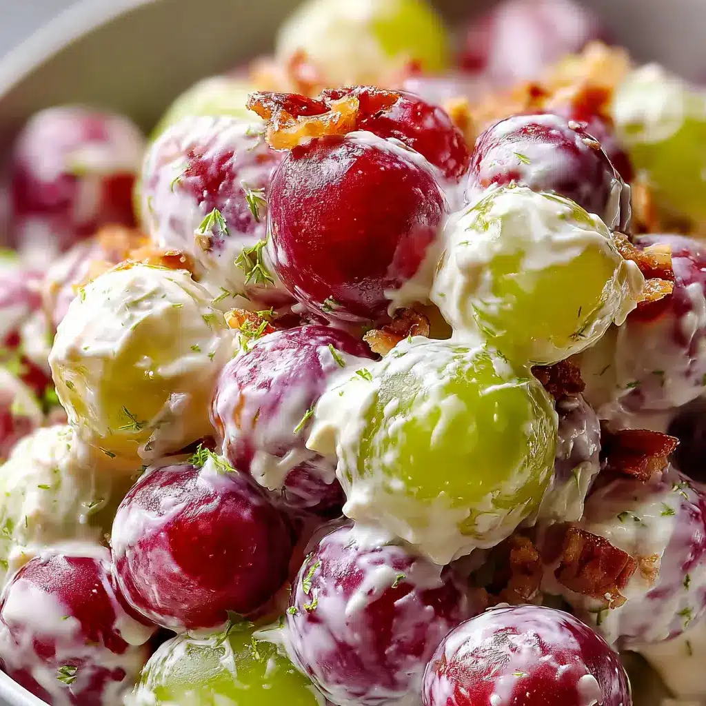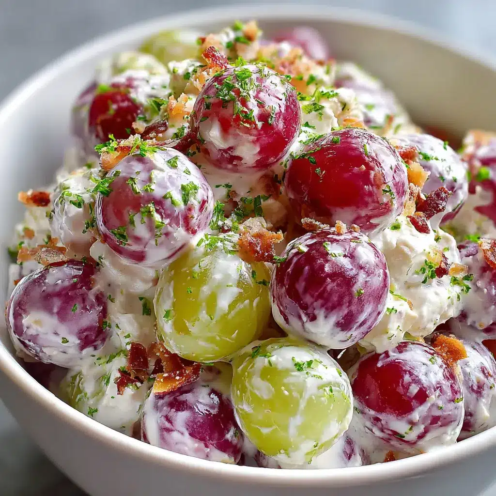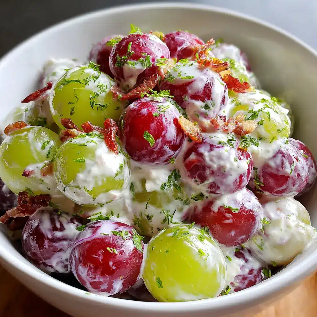 A delightful and refreshing creamy grape salad that combines sweet grapes and savory turkey bacon, perfect for any occasion.