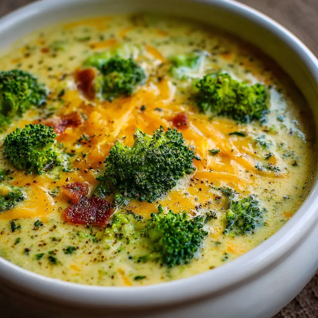A deliciously creamy soup featuring fresh broccoli, cheddar cheese, and crispy turkey bacon, perfect for a cozy meal.