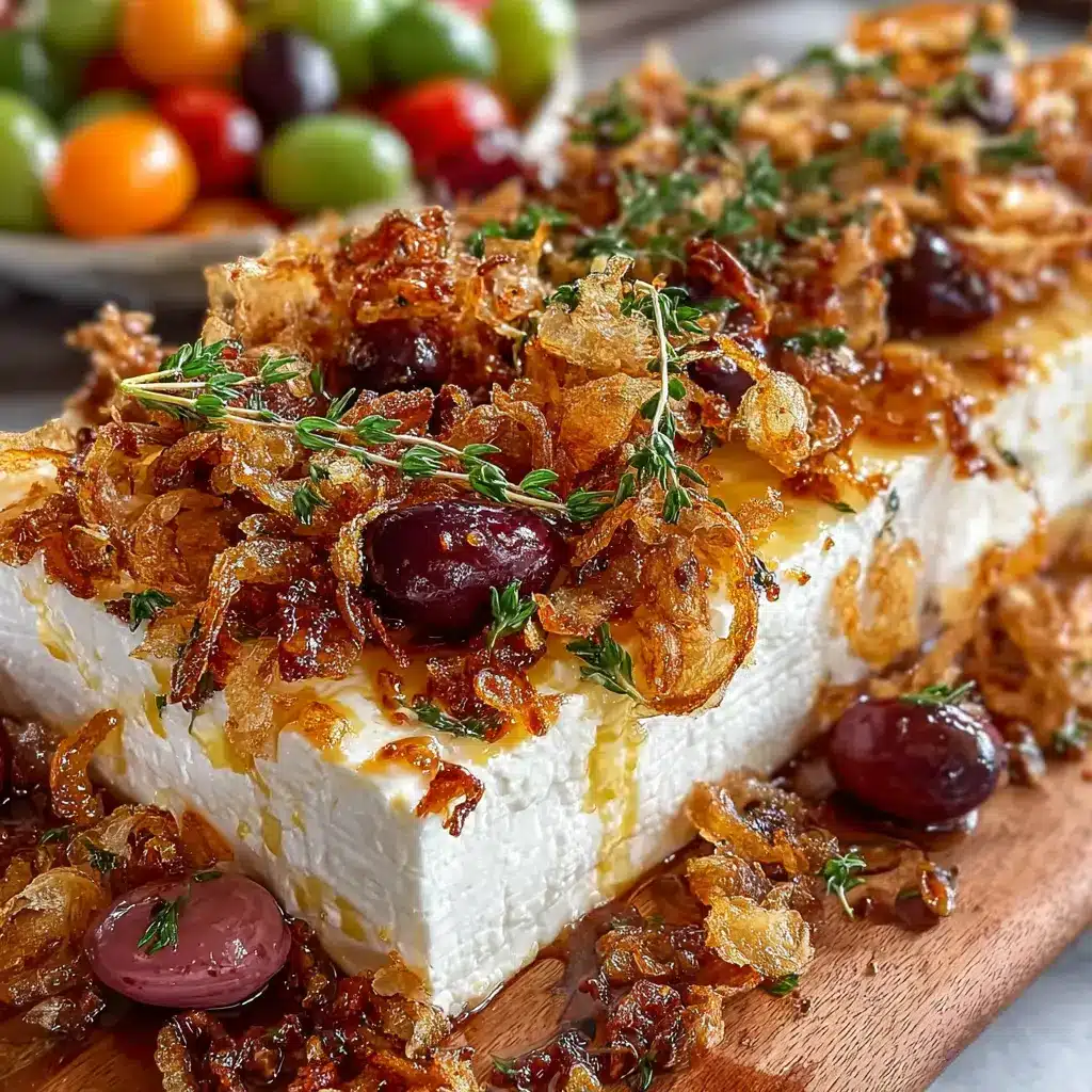 Indulge in the savory and sweet flavors of a Greek Feta Board topped with hot honey and crispy fried onions. Perfect for entertaining!