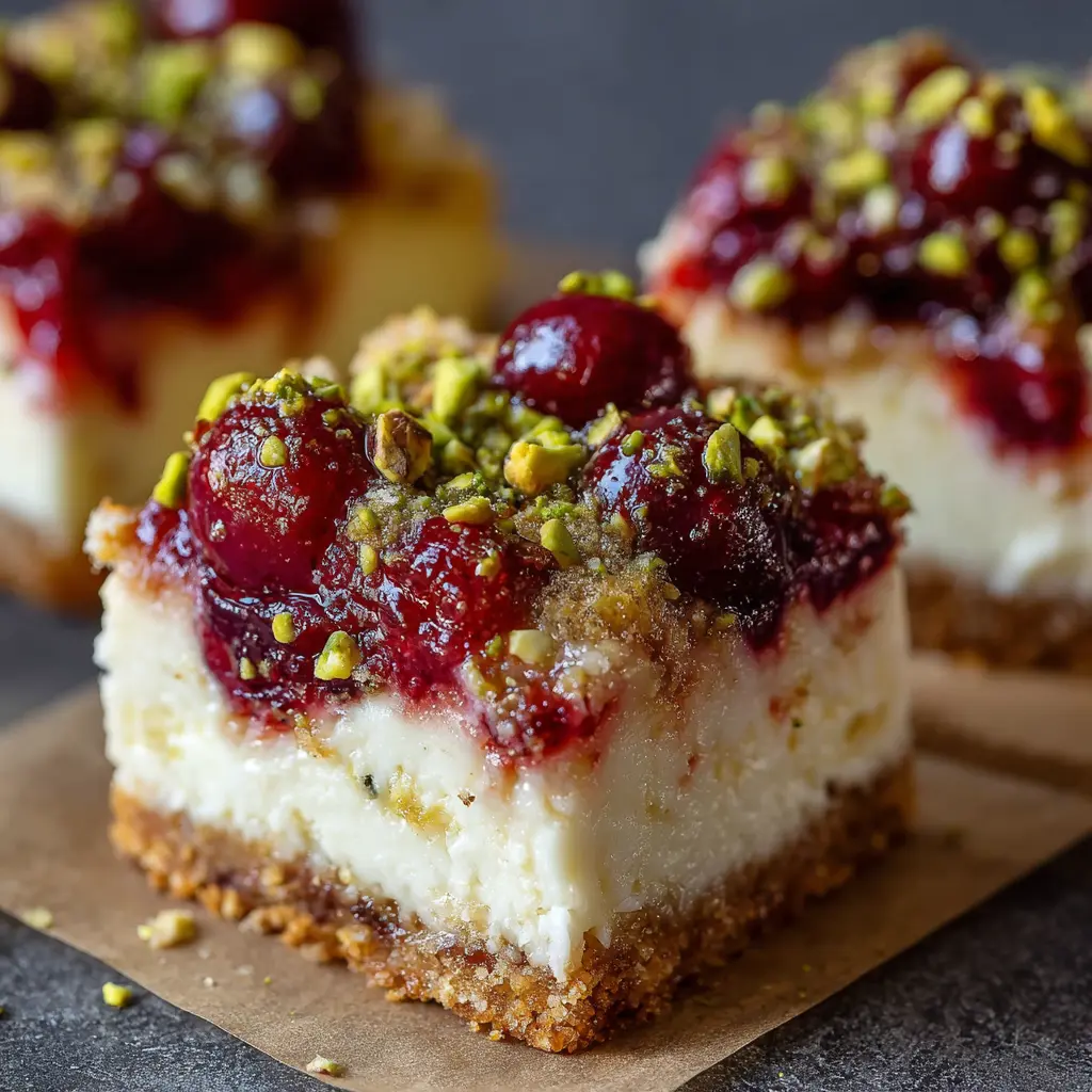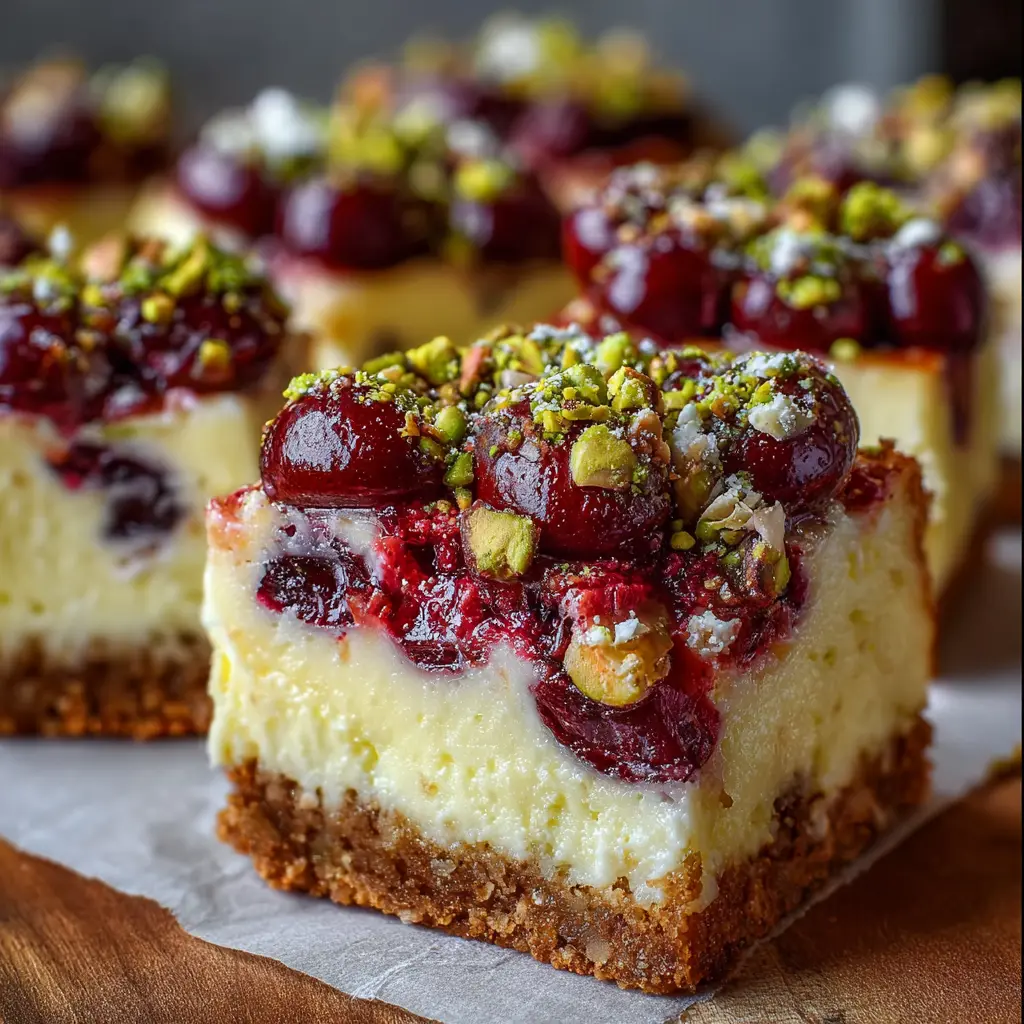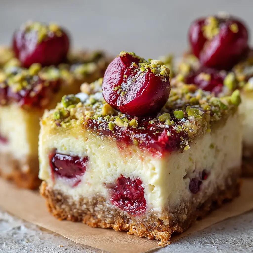 A delightful dessert combining the rich flavors of cherry and pistachio in a creamy cheesecake bar.