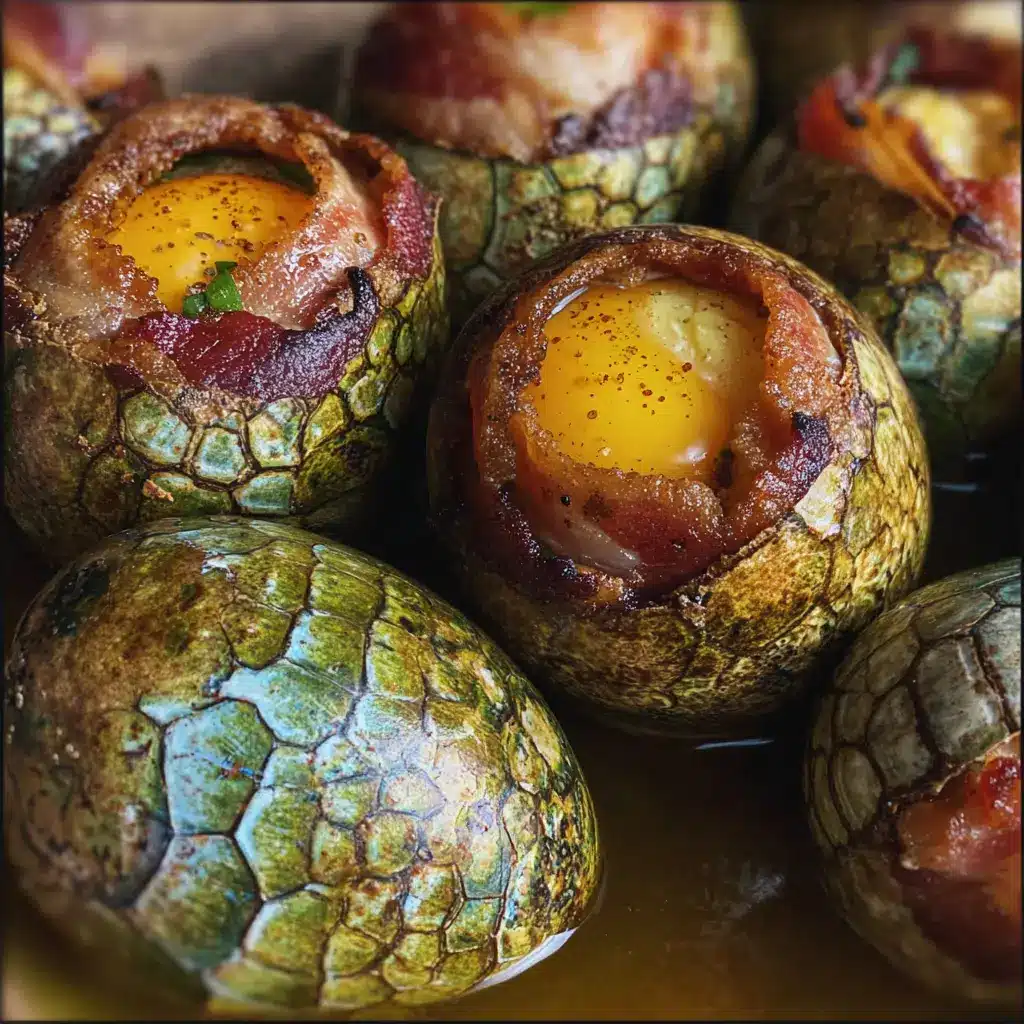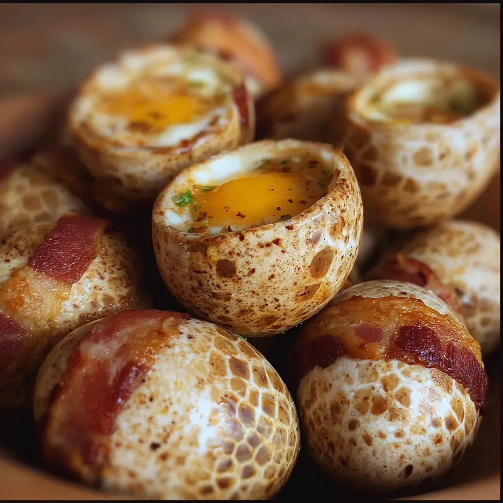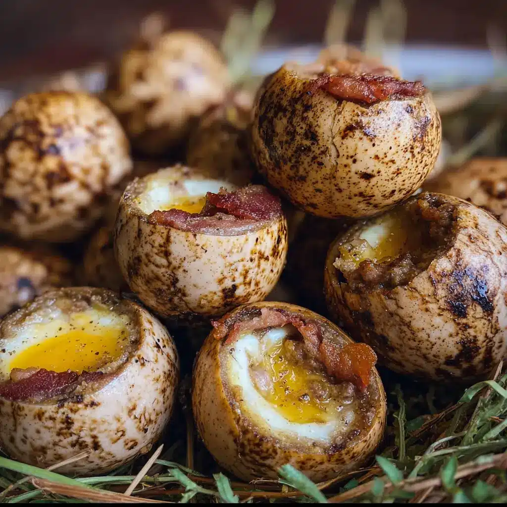 Experience the rich and savory flavors of Hillbilly Gator Eggs, a delightful dish featuring turkey bacon and chicken ham that is sure to impress.