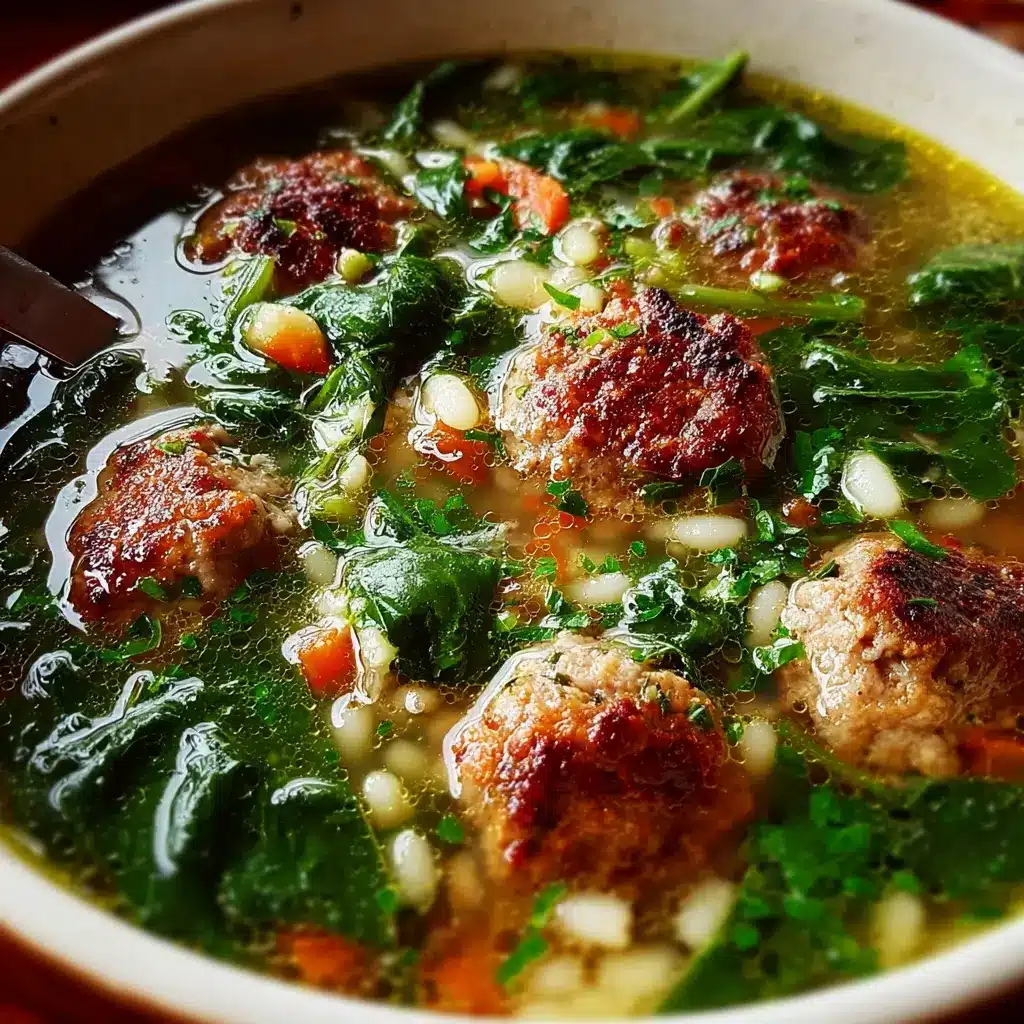 A hearty and comforting soup featuring meatballs, greens, and flavorful broth.