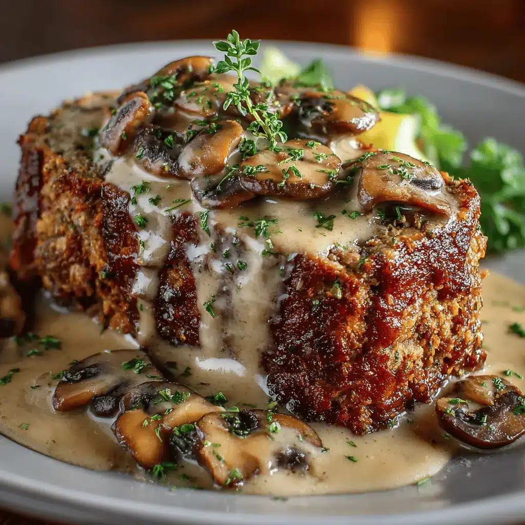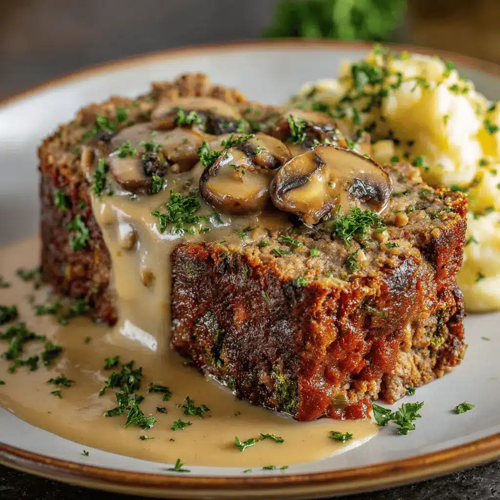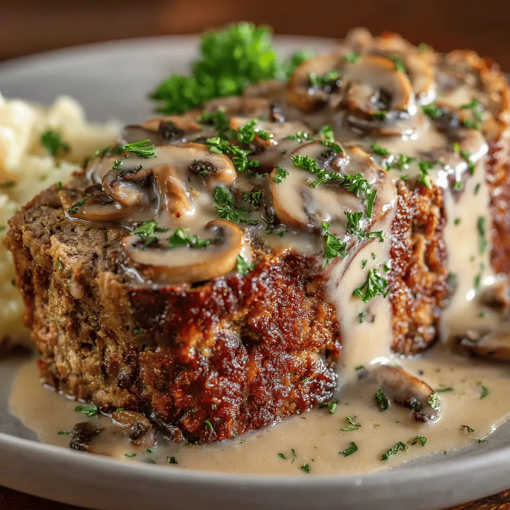 A delectable homemade meatloaf served with a rich and creamy mushroom gravy, perfect for family dinners.