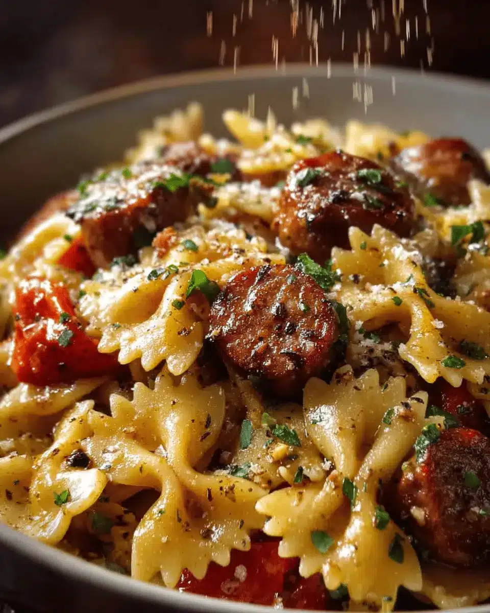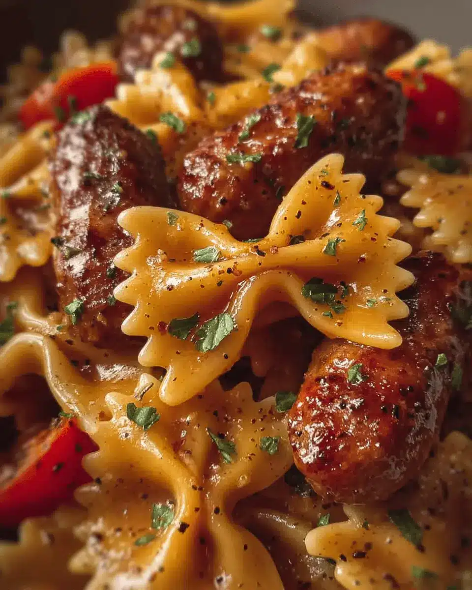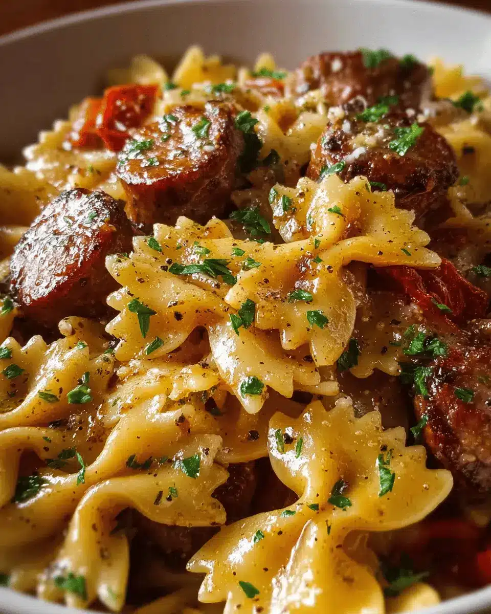 Pasta Cooking Secrets: Ensure your bow tie pasta is al dente by following package instructions and tasting a minute before the suggested time. This bite-sized shape adds a fun texture that pairs perfectly with savory sausage.