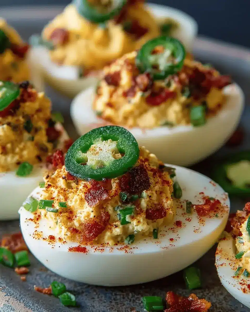 Jalapeño Popper Deviled Eggs with Turkey Bacon: A Spicy Delight