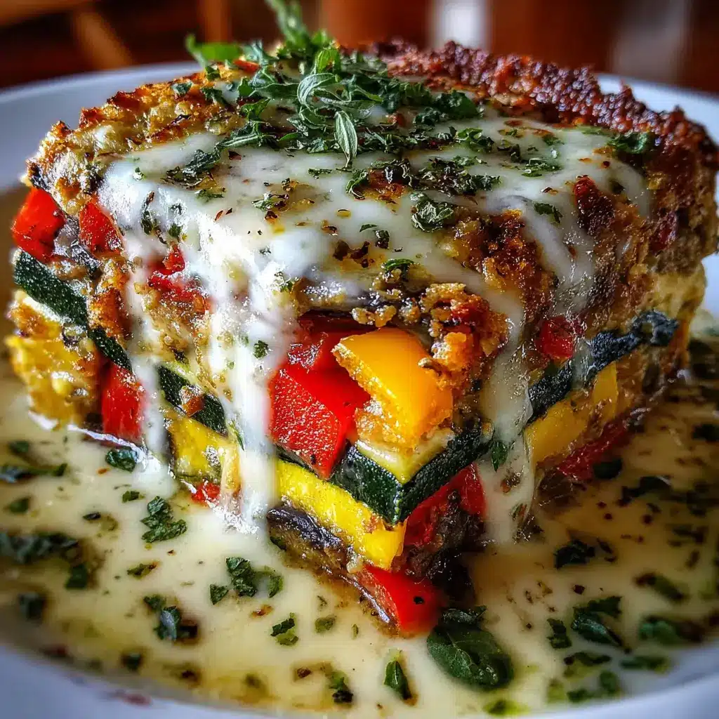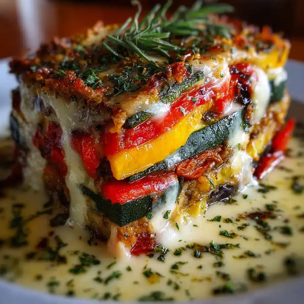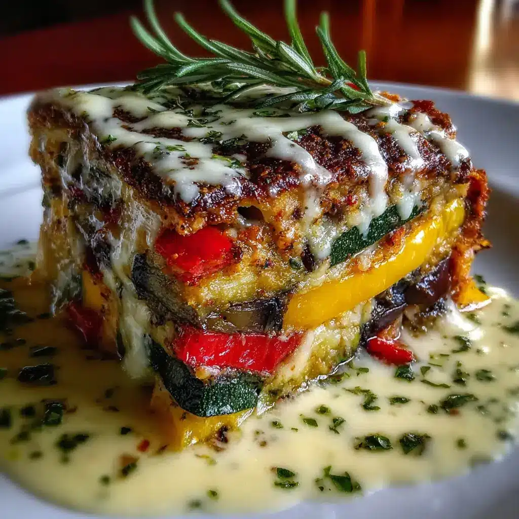A delightful and healthy lasagna made with layers of eggplant, zucchini, and bell peppers, topped with a creamy garlic herb three-cheese drizzle.
