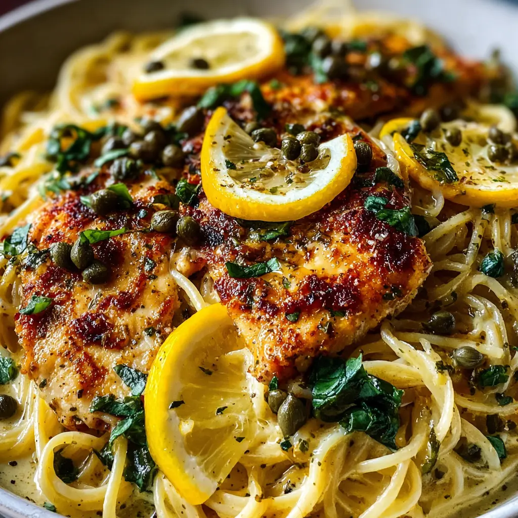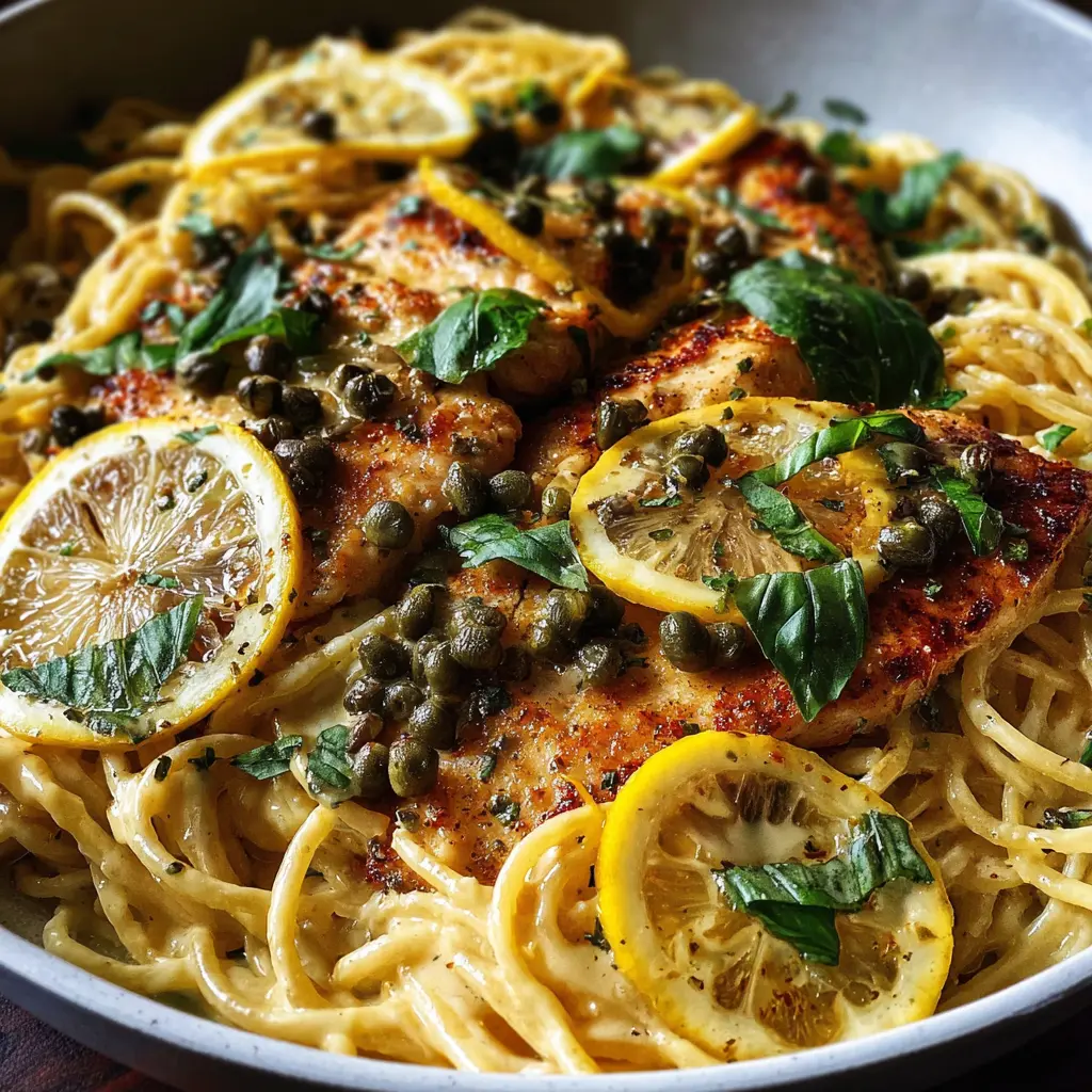A delicious and easy weeknight dish featuring lemon basil chicken, pasta, and crispy capers.