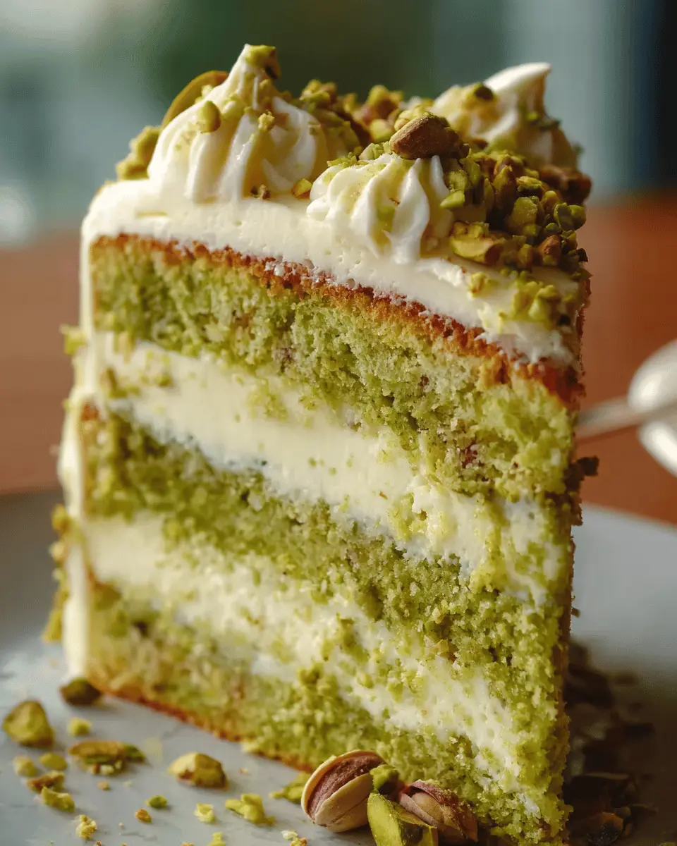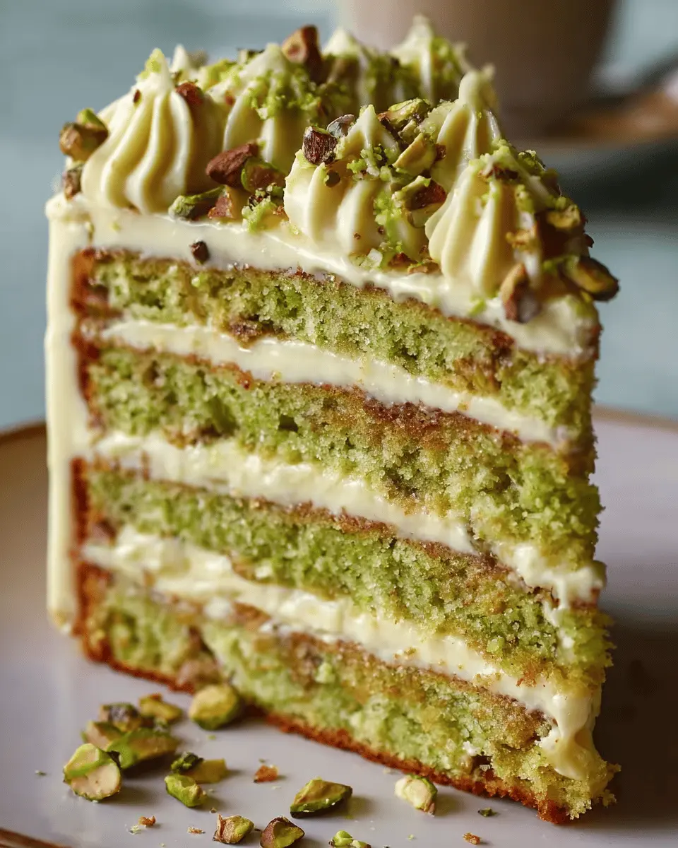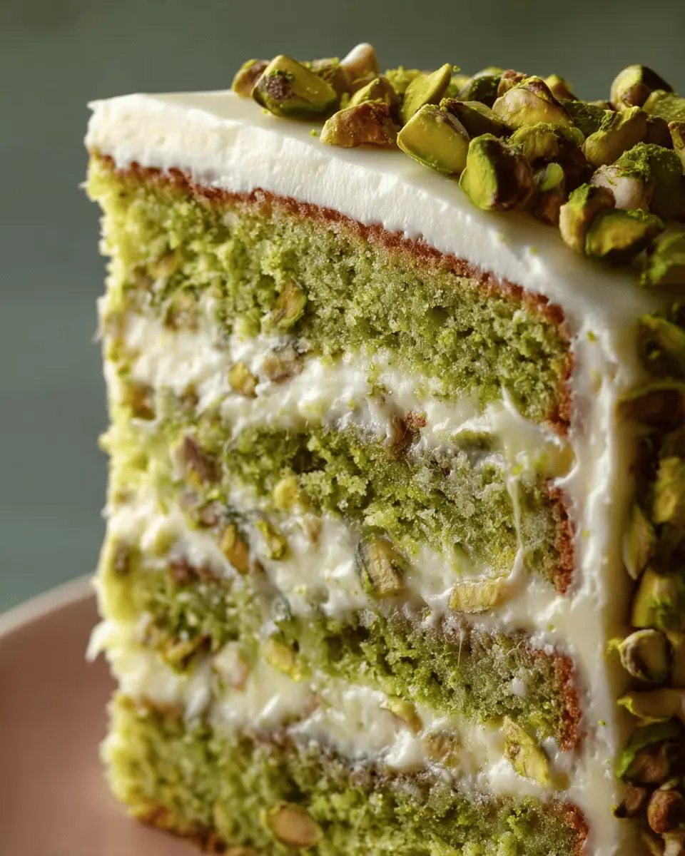 A rich and creamy cake that is full of delicious pistachio flavor, perfect for special occasions or an indulgent dessert.