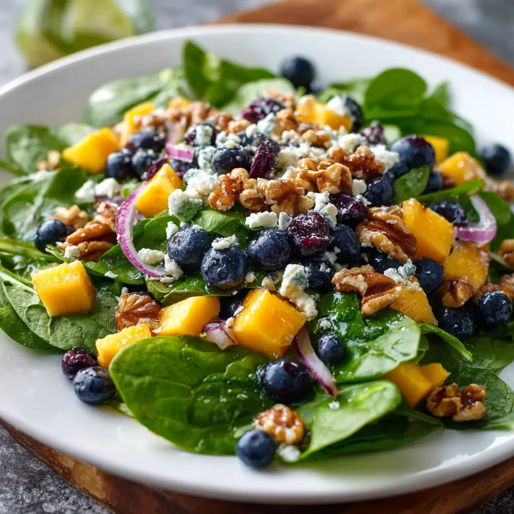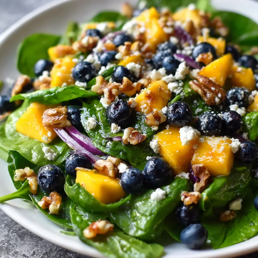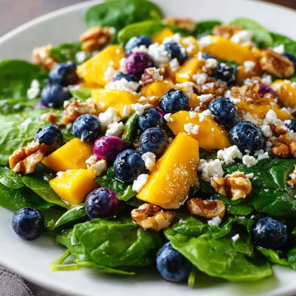 This vibrant Mango Blueberry Spinach Salad is a refreshing treat, perfectly combined with walnuts and feta cheese.