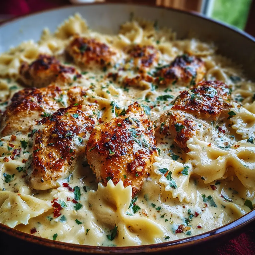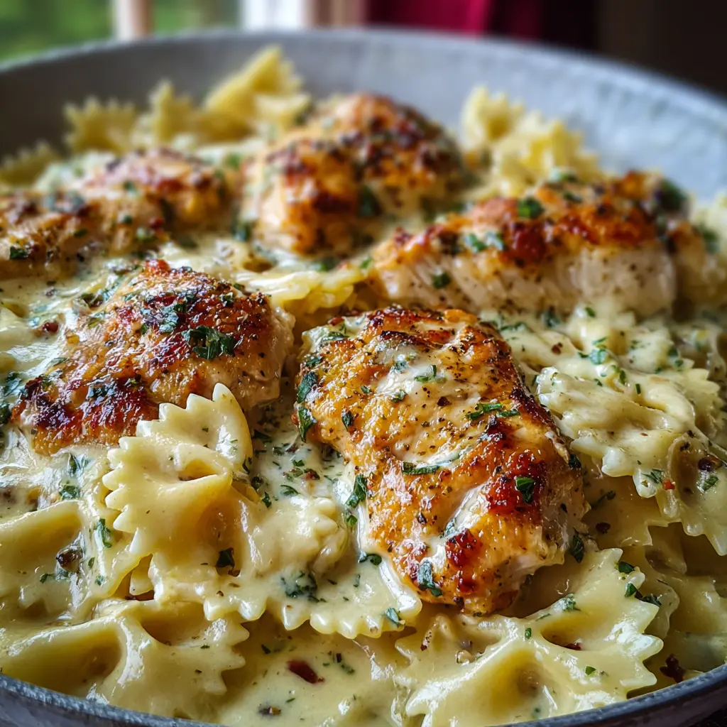 Indulge in the creamy, cheesy goodness of Mozzarella Garlic Butter Chicken Bowties. A delightful dish perfect for any occasion.