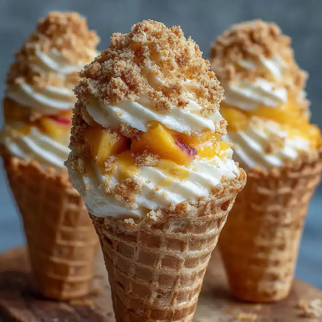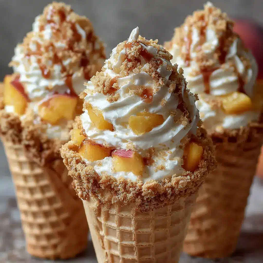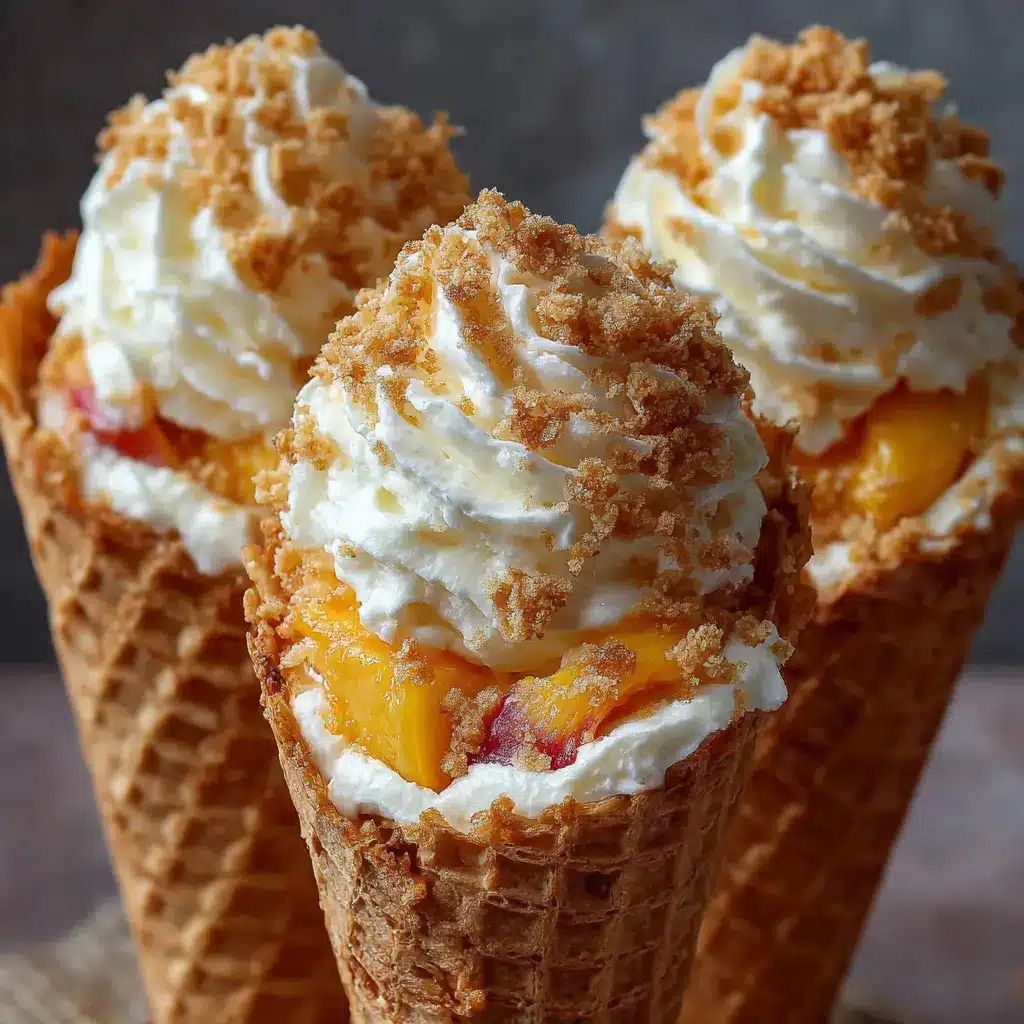 Delightful Peach Cobbler Cheesecake Cones that blend the classic flavors of peach cobbler with a creamy cheesecake filling, all served in a crispy cone.