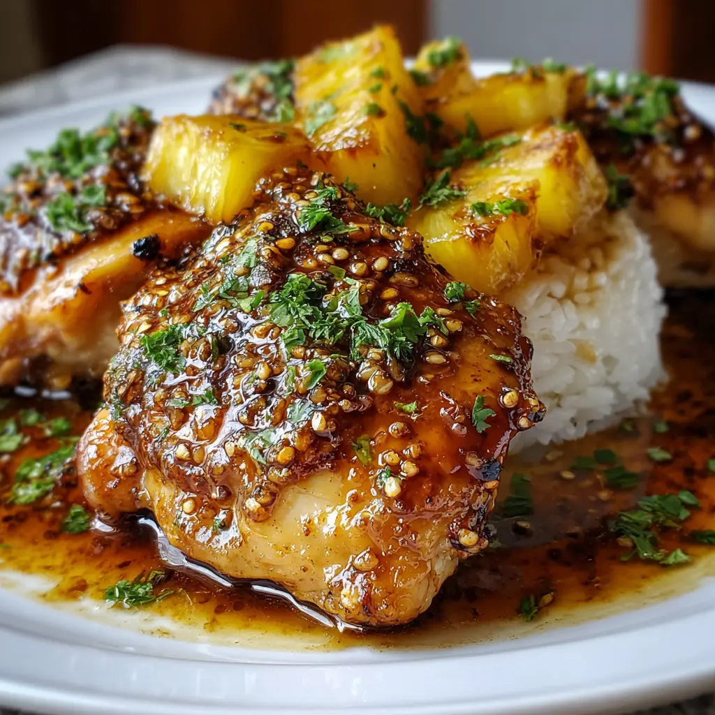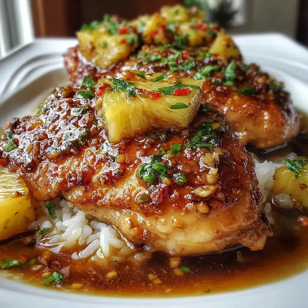 A delicious and juicy chicken dish filled with sweet pineapple and drizzled with honey garlic sauce.