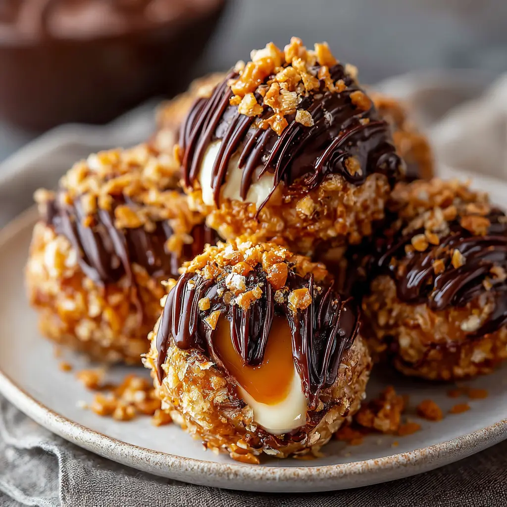 - Drizzle warm caramel sauce over each coated cheesecake ball using a spoon or a piping bag.