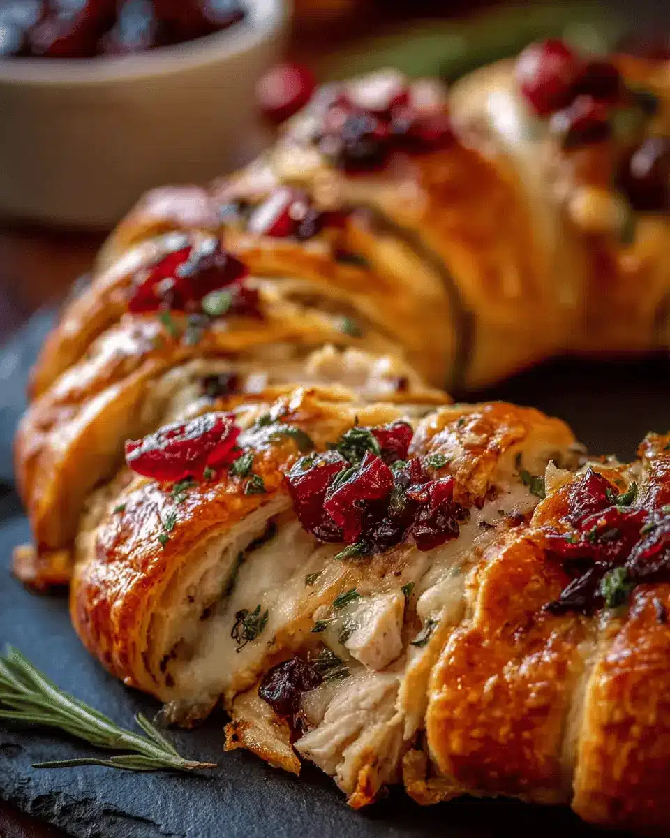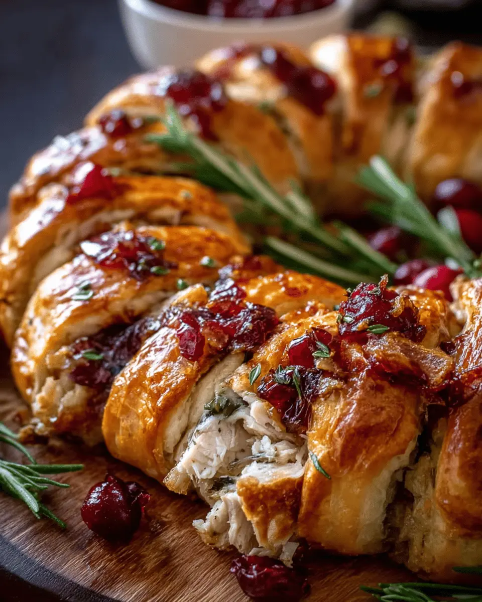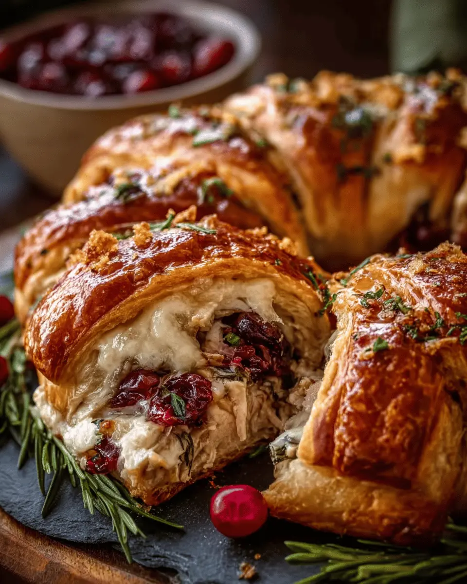 A savory and visually appealing dish perfect for any gathering, featuring turkey and cranberry wrapped in crescent dough.