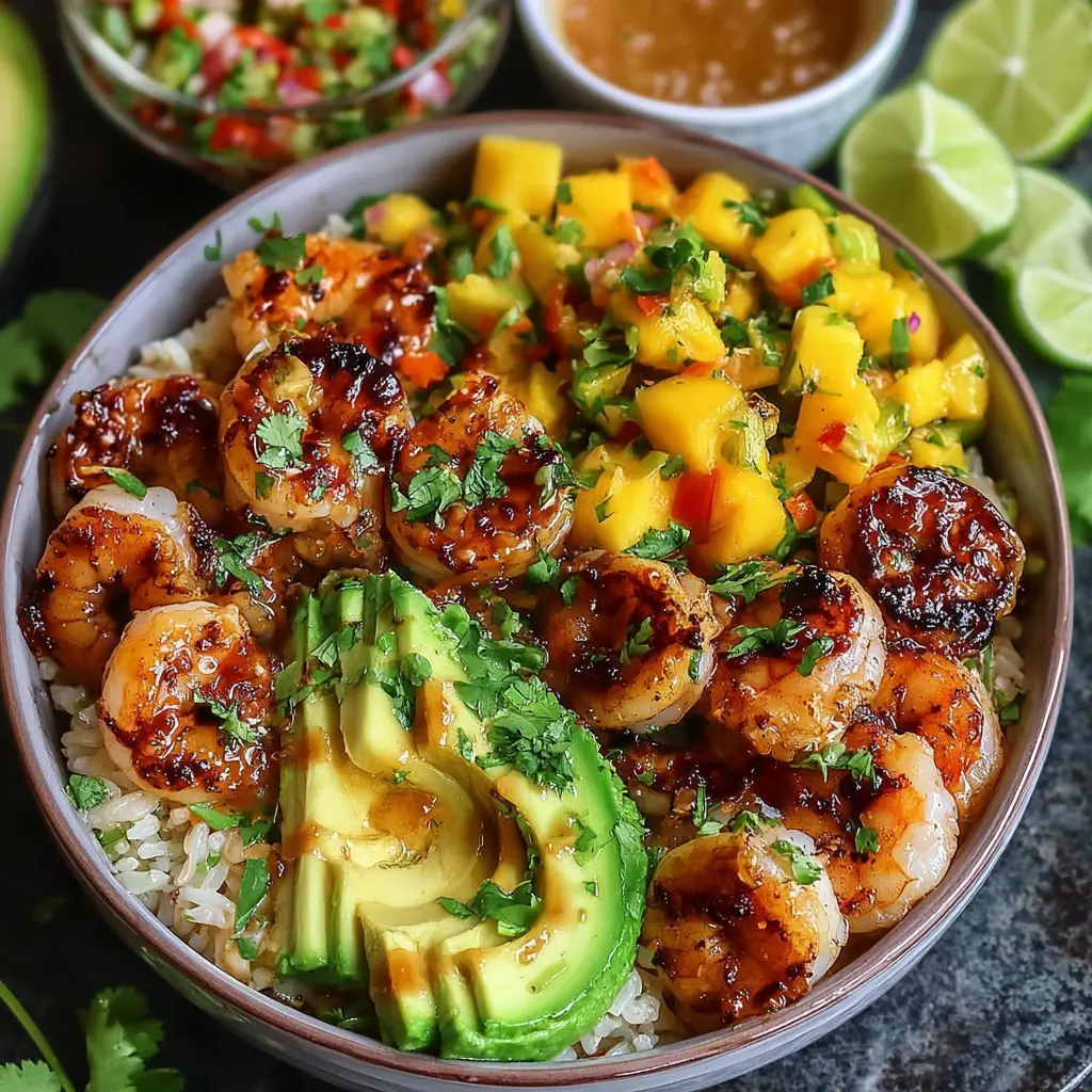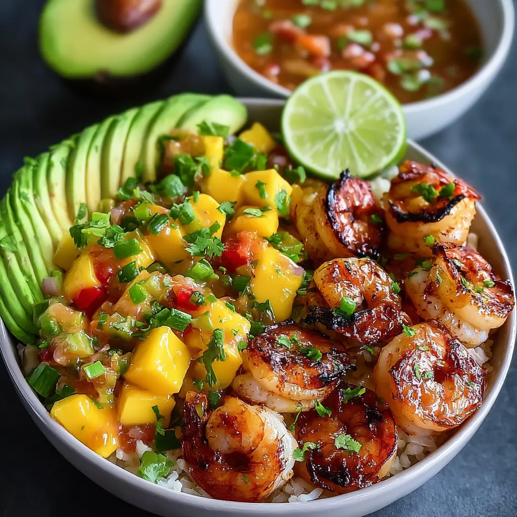 - Assemble the bowls by placing the diced avocados at the bottom, followed by the grilled shrimp and a generous scoop of mango salsa on top.