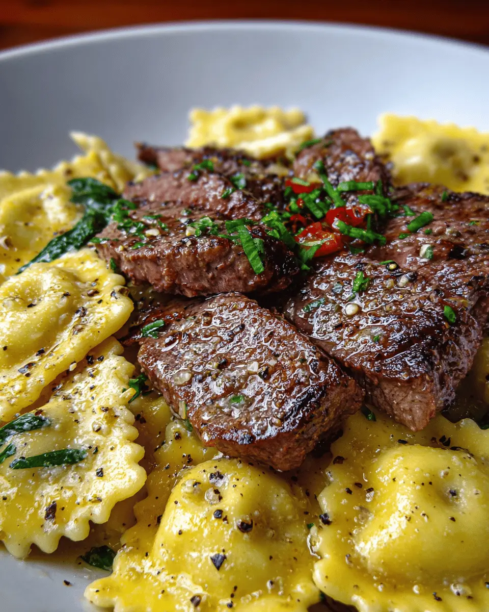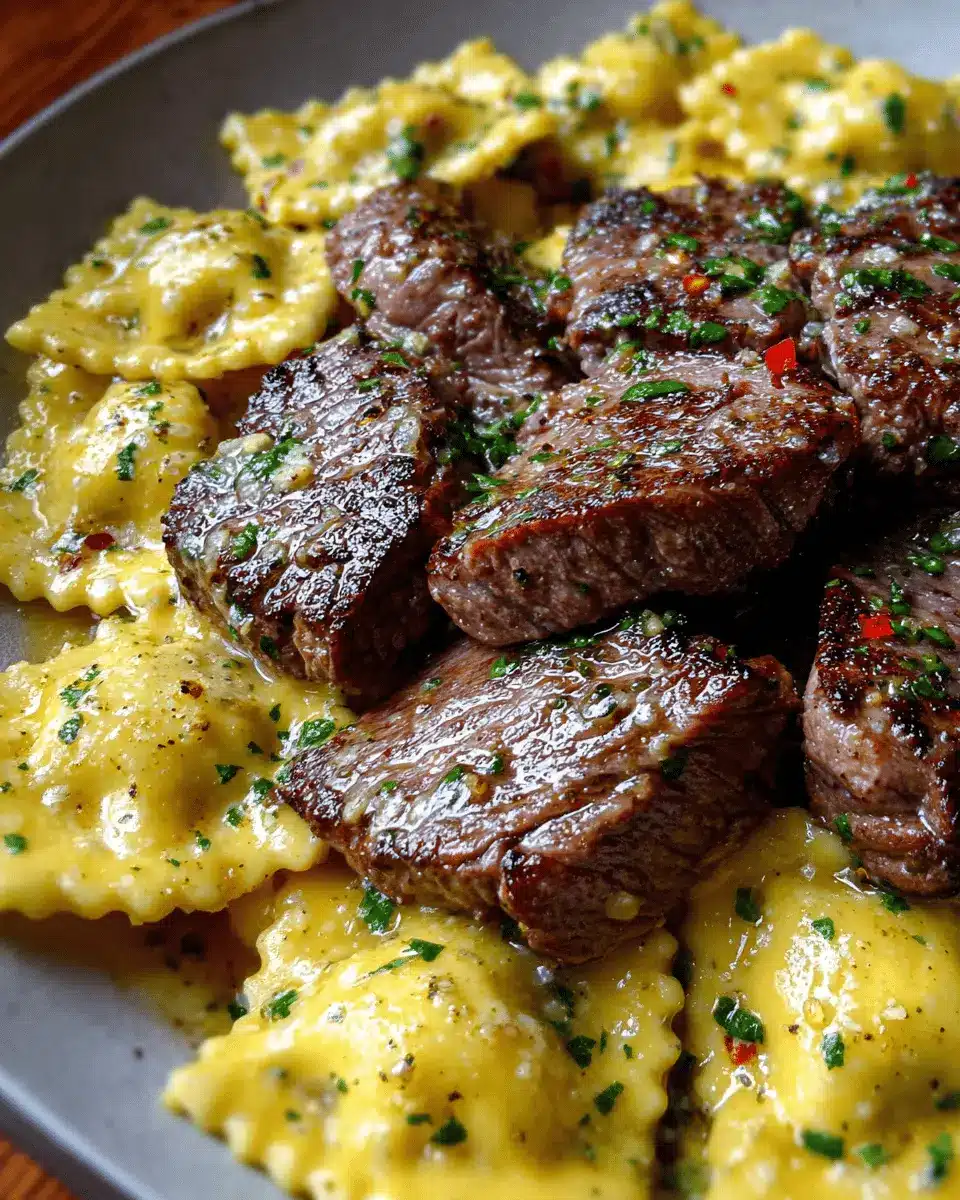 A rich and delicious dish featuring tender steak cuts paired with cheese ravioli, all enveloped in a creamy garlic butter sauce.