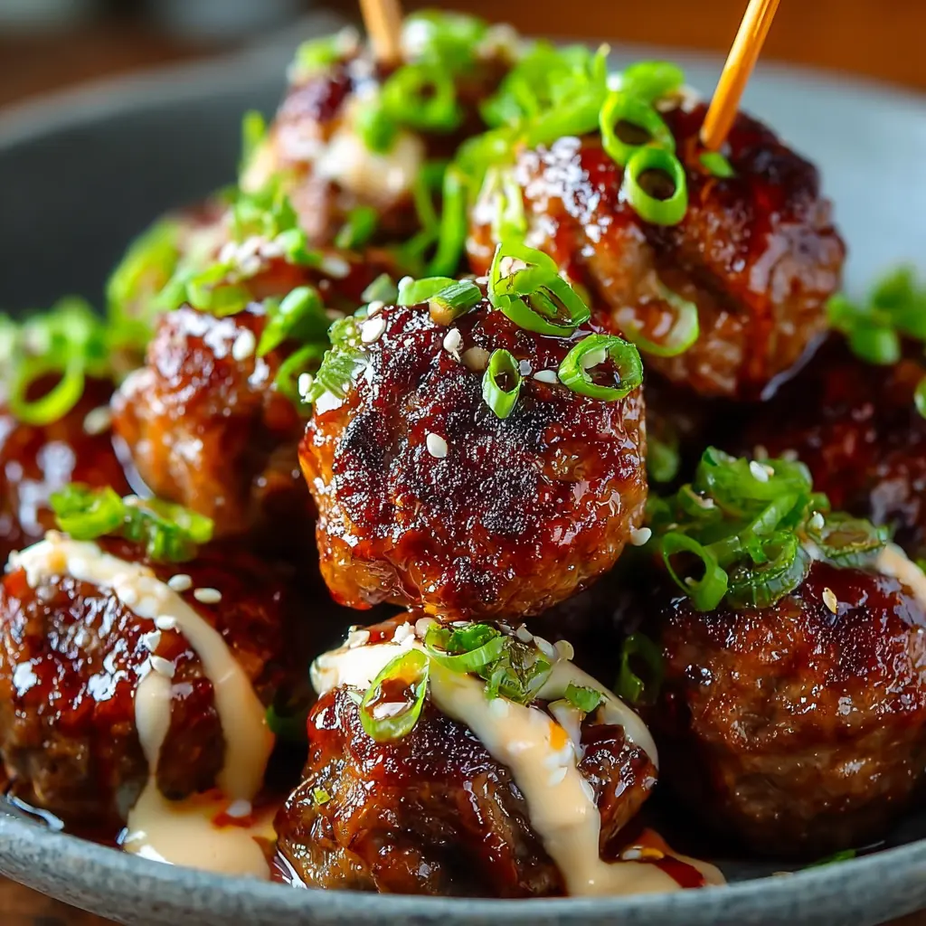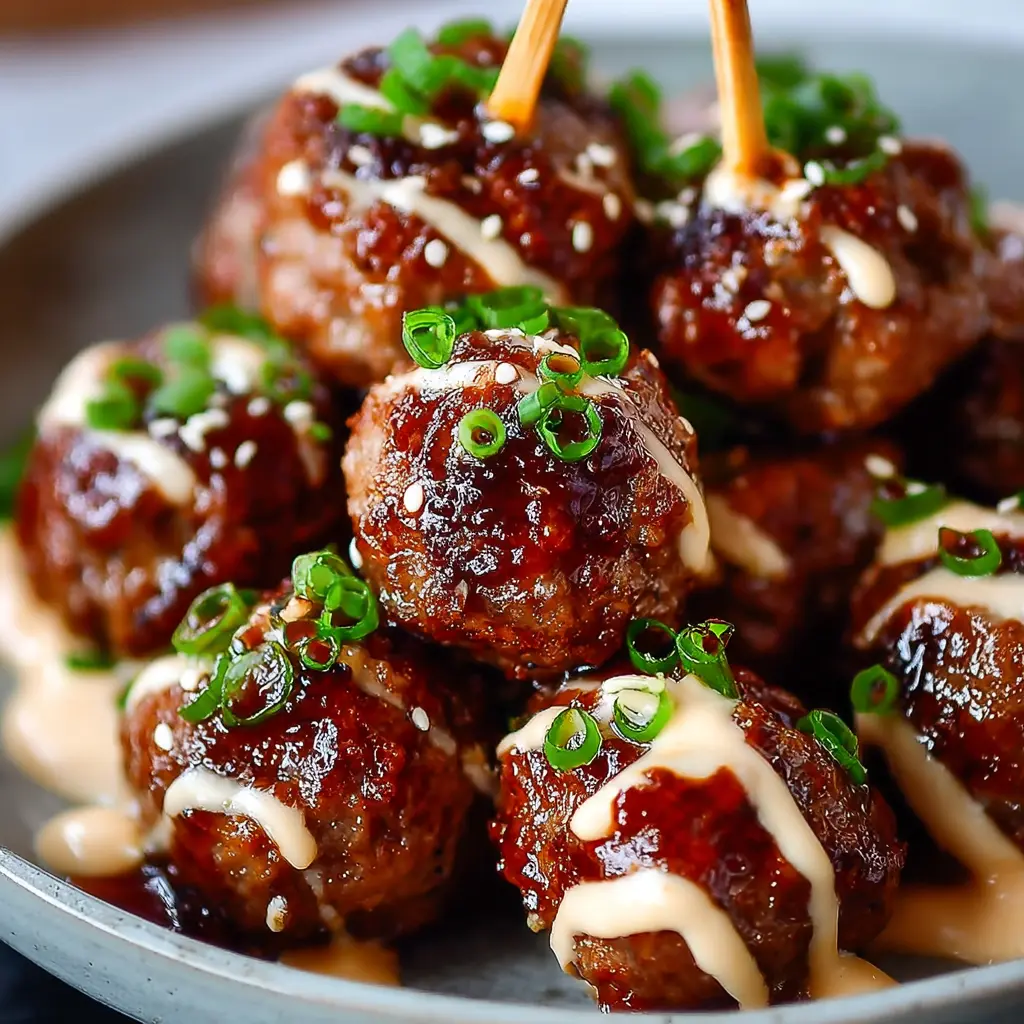 - Serve the meatballs hot, drizzled with the spicy mayo and garnished with additional green onions.