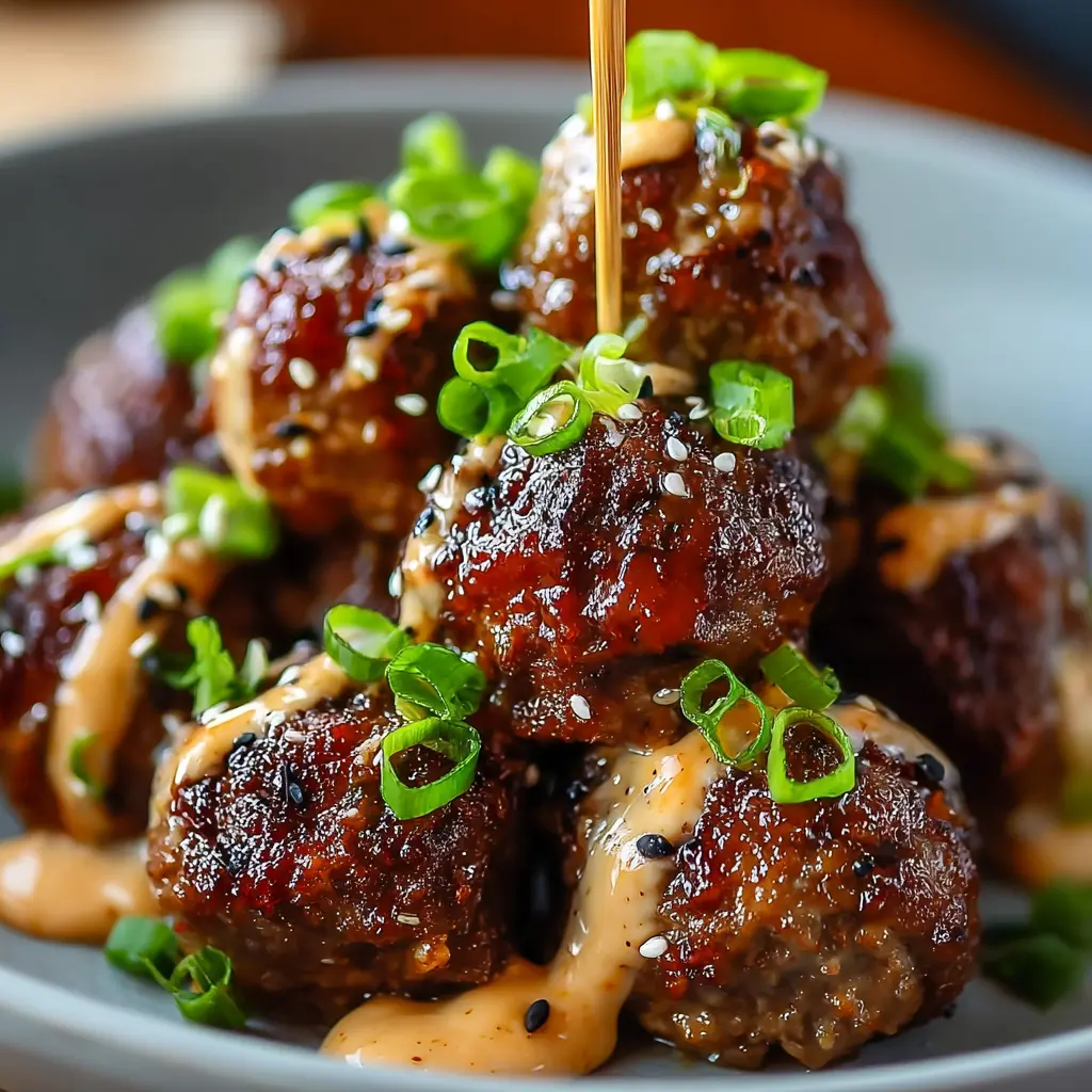 A delicious recipe for Sticky Korean Glazed Meatballs paired with a spicy mayo sauce, offering an irresistible flavor combination.