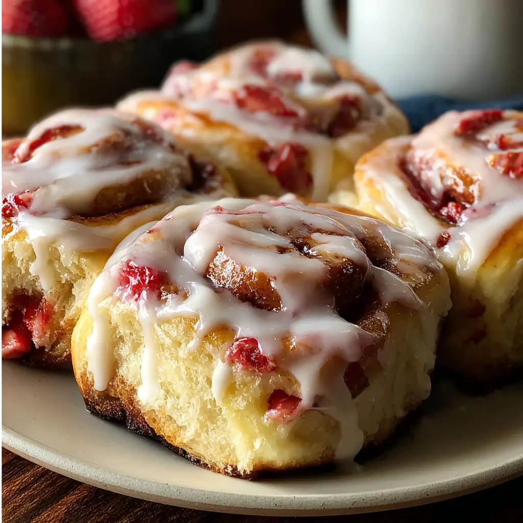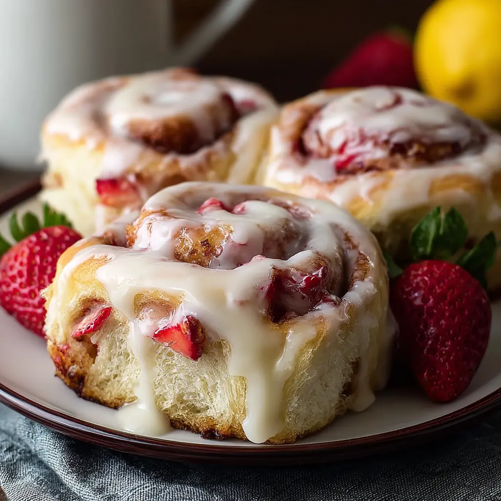 Deliciously soft and fluffy strawberry cinnamon rolls topped with a zesty lemon cream cheese glaze, perfect for brunch or dessert.