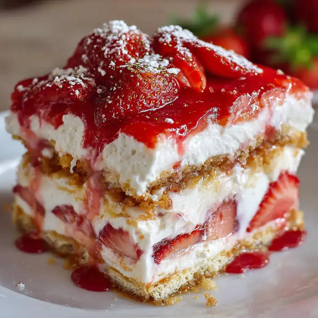 This Strawberry Lasagna is a delightful no-bake dessert featuring layers of creamy filling, fresh strawberries, and delicious graham crackers.