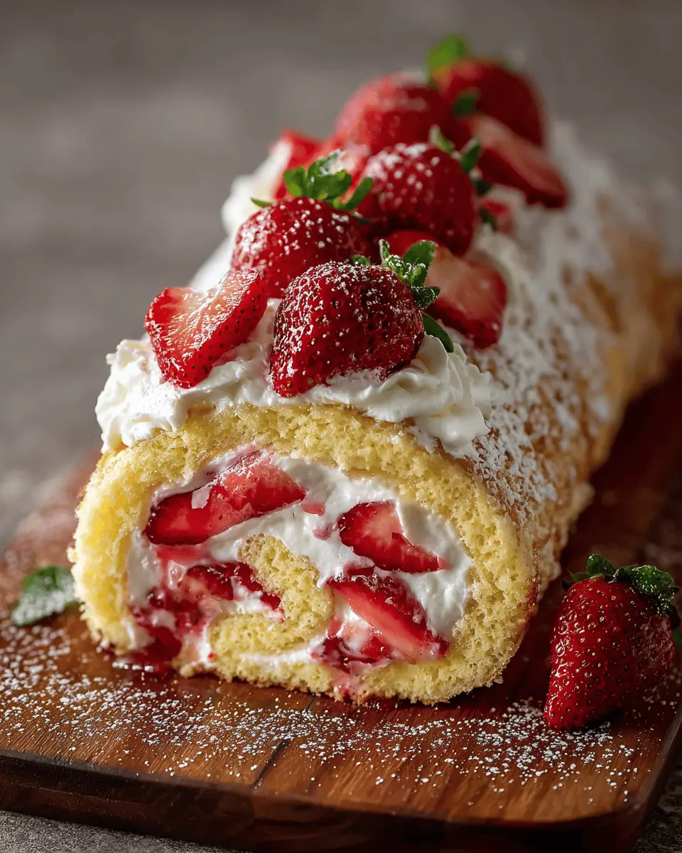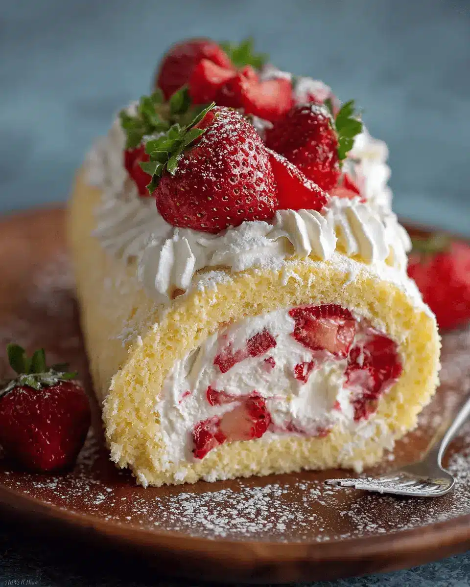 Place the roll seam-side down on a serving platter, and, if you’re up for it, you can top it with more whipped cream and strawberries for that picture-perfect finish. Slice into portions, serve, and enjoy the delightful surprise that every bite brings!