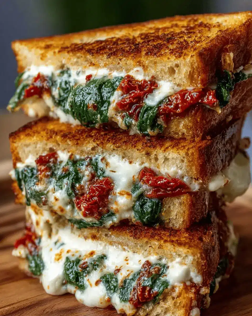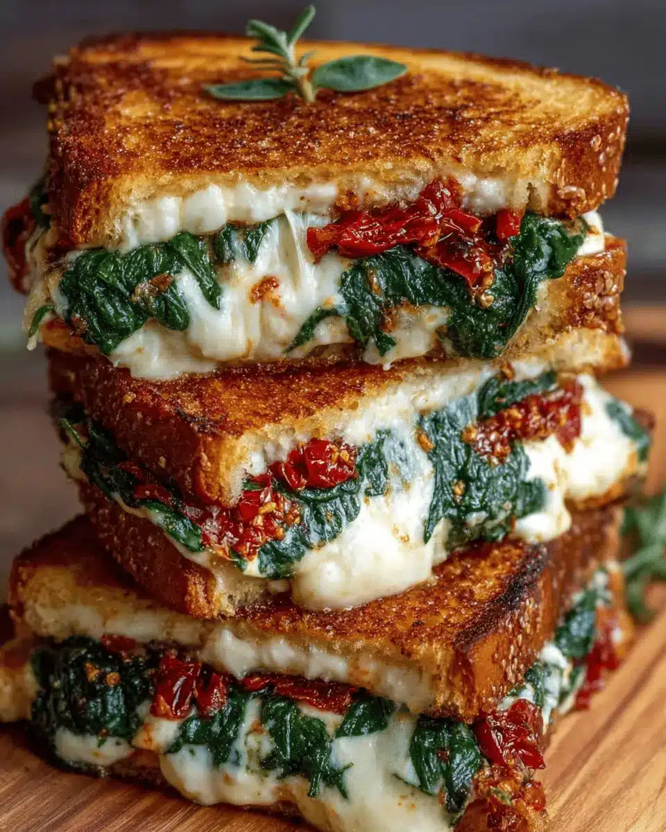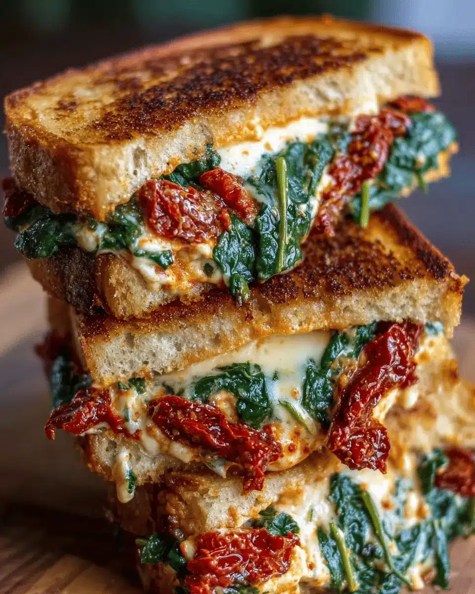 Indulge in the creamy, savory delight of Sun-Dried Tomato, Spinach & Ricotta Grilled Cheese, a perfect blend of flavors.