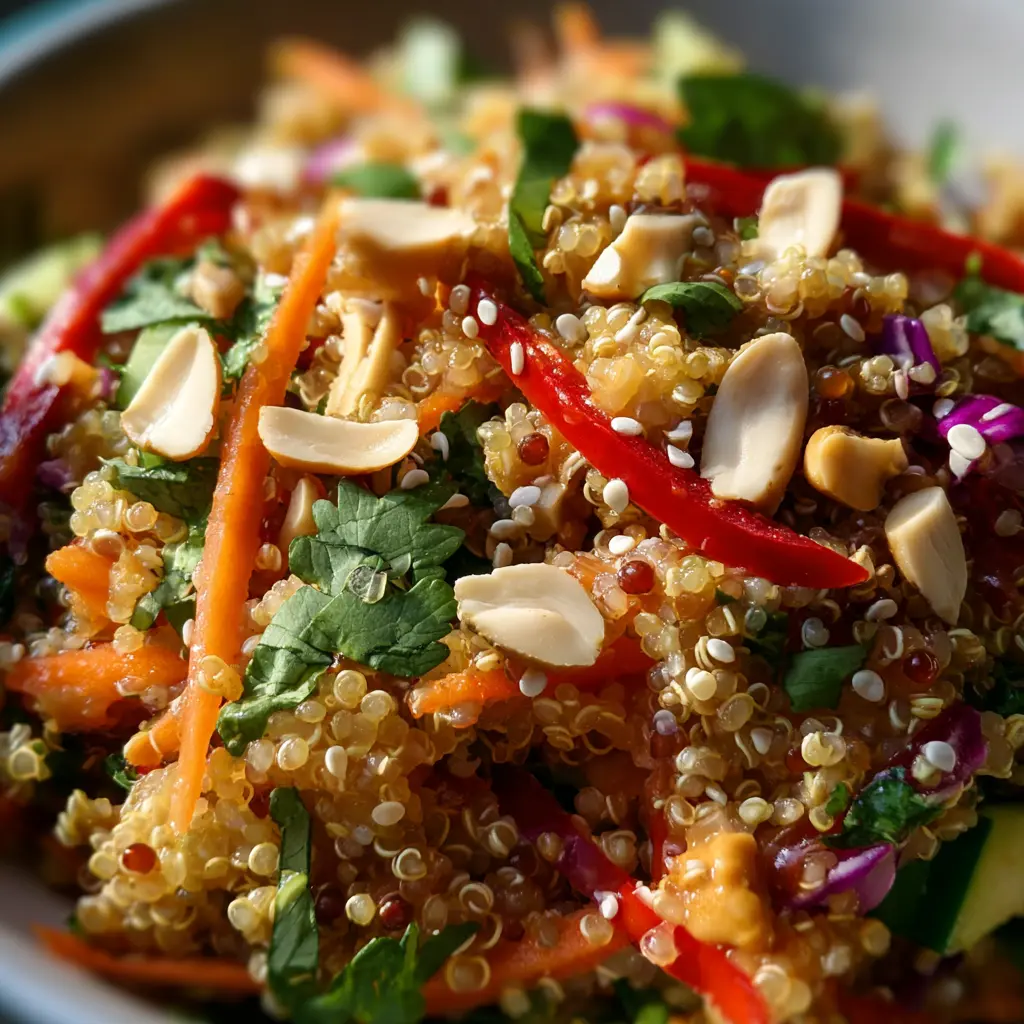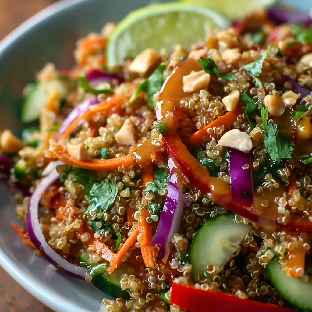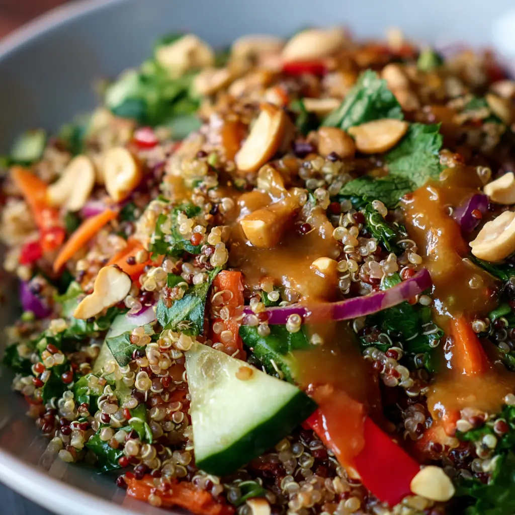 A delicious and nutritious salad featuring quinoa tossed with fresh veggies and a creamy Thai peanut dressing.
