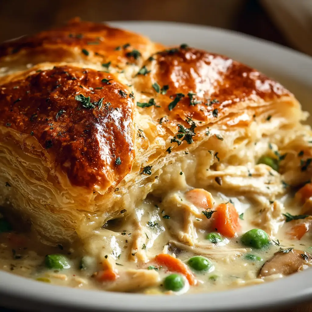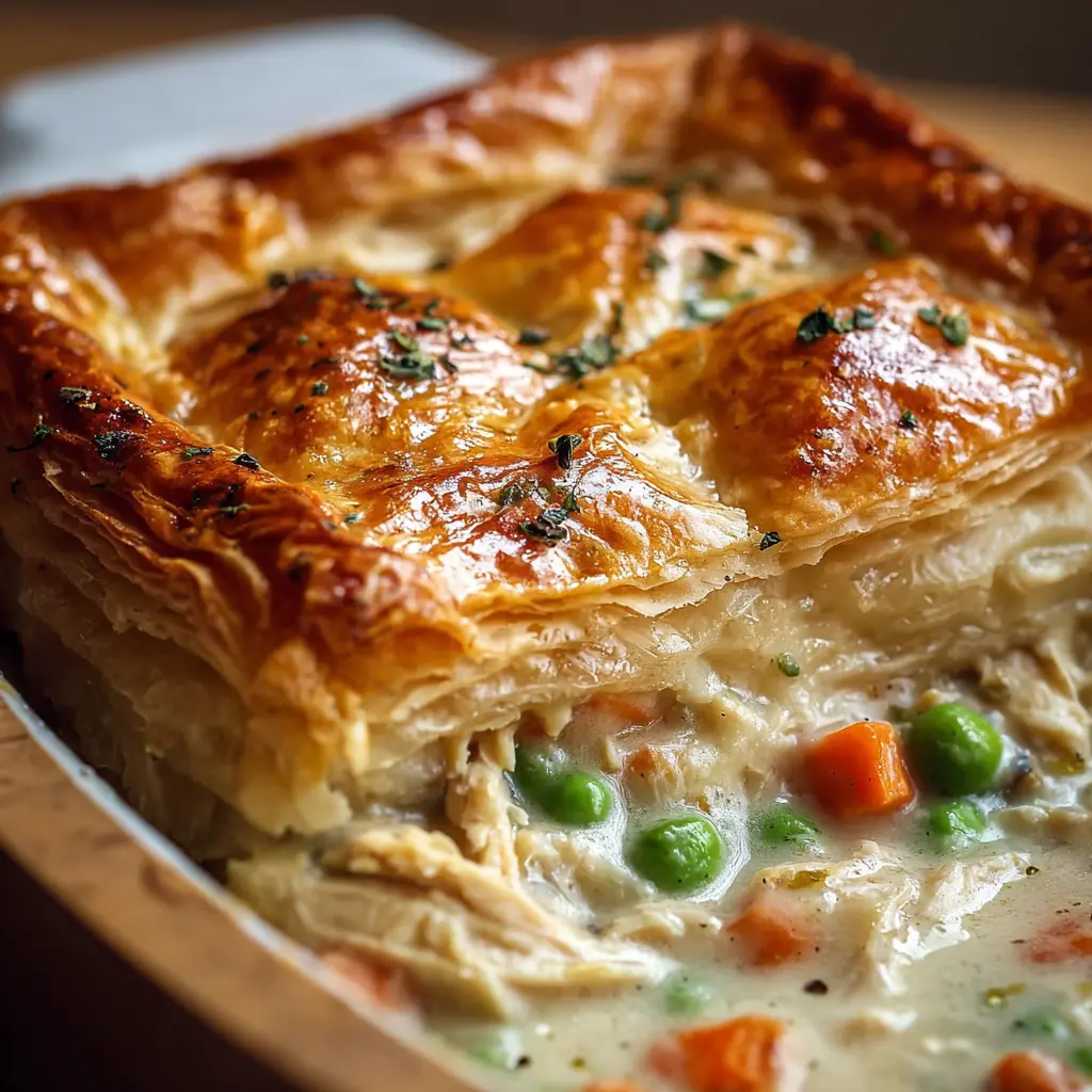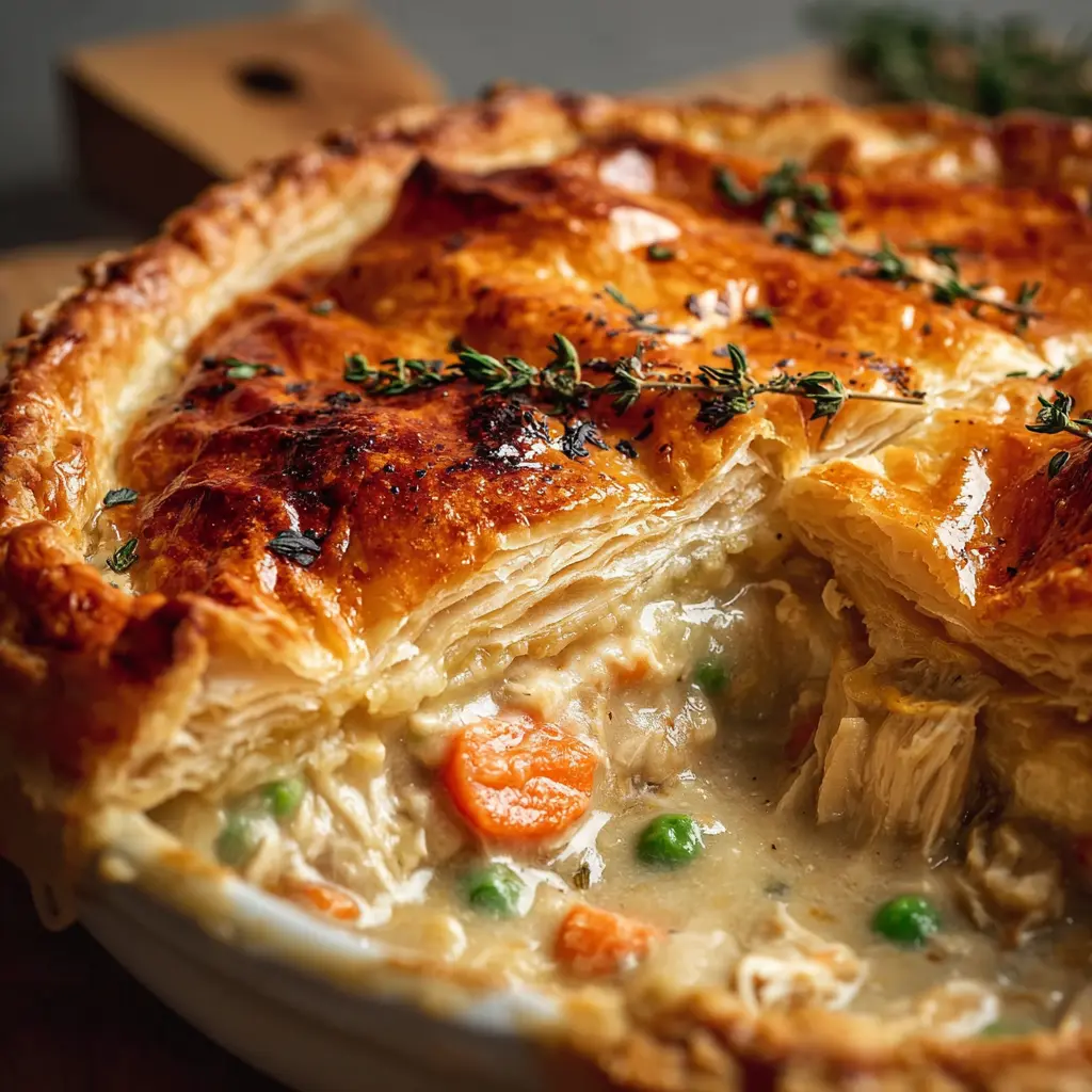 Enjoy the comfort of a traditional chicken pot pie made easy with puff pastry. Perfect for a cozy weeknight meal!