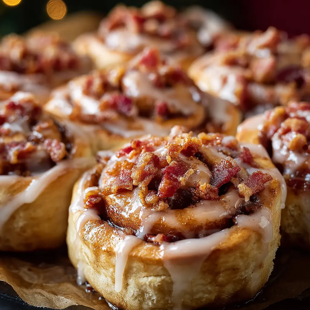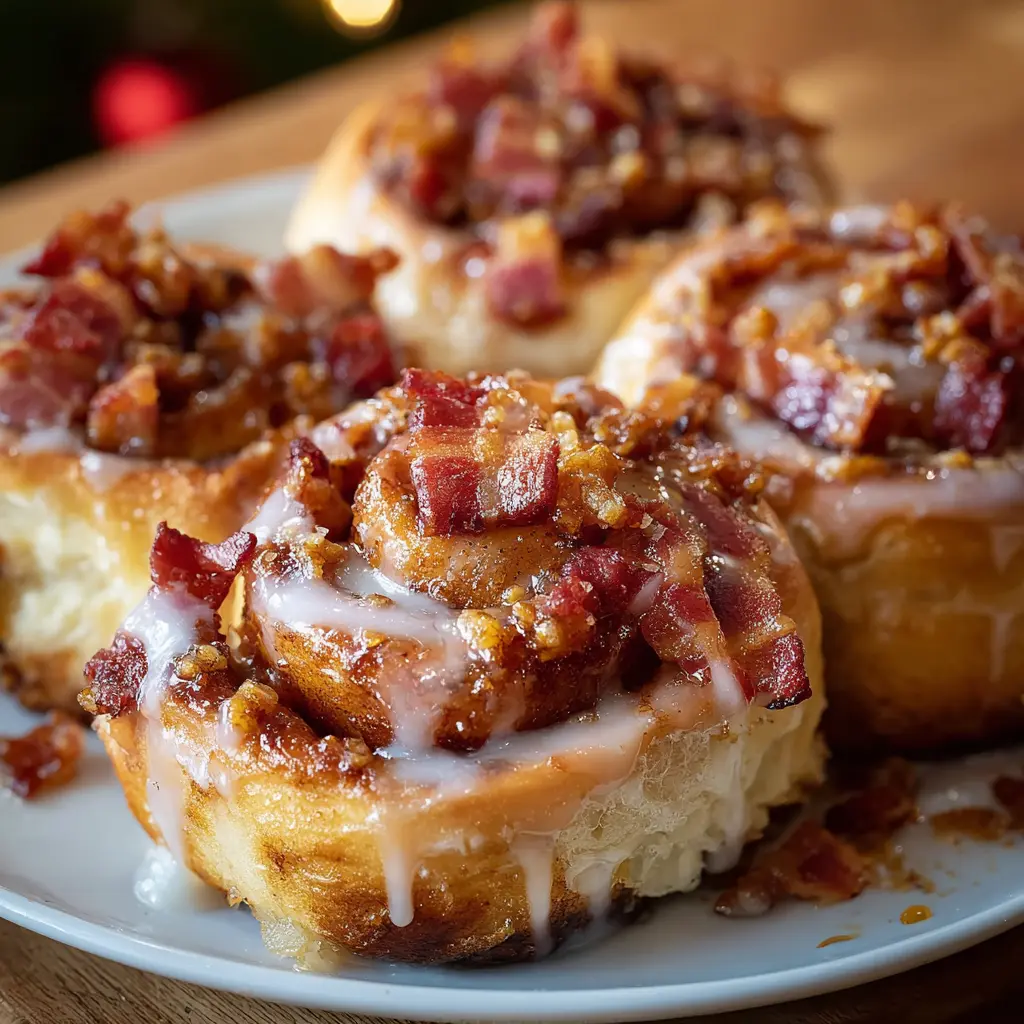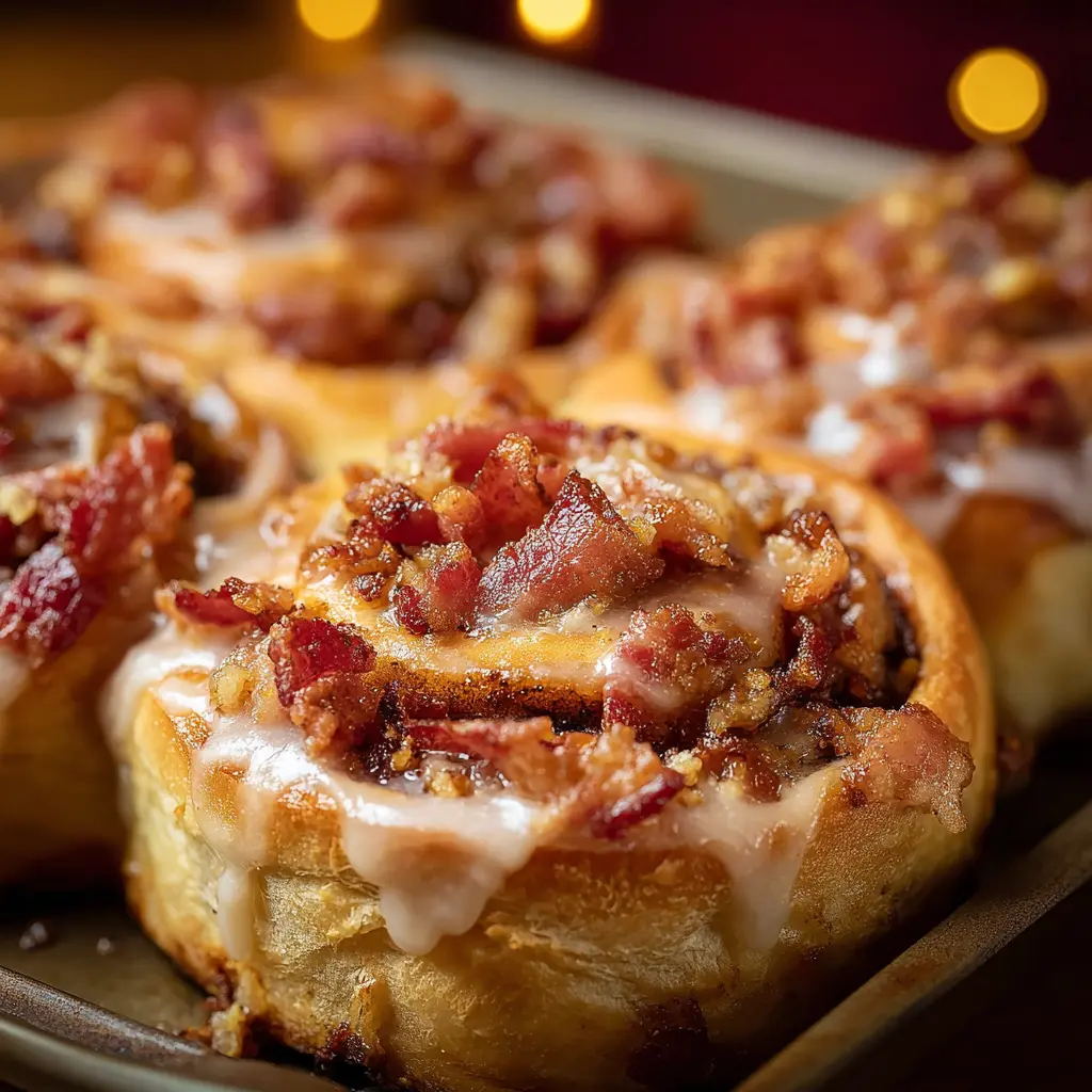 Indulge in these delicious Turkey Bacon Maple Cinnamon Rolls that combine sweet and savory flavors for a delightful treat.