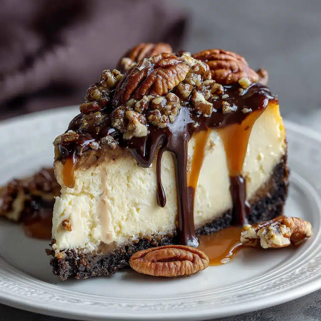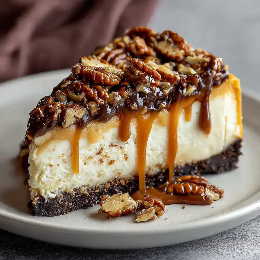 Turtle Cheesecake is a delicious dessert that combines rich chocolate, creamy cheesecake, and crunchy pecans.