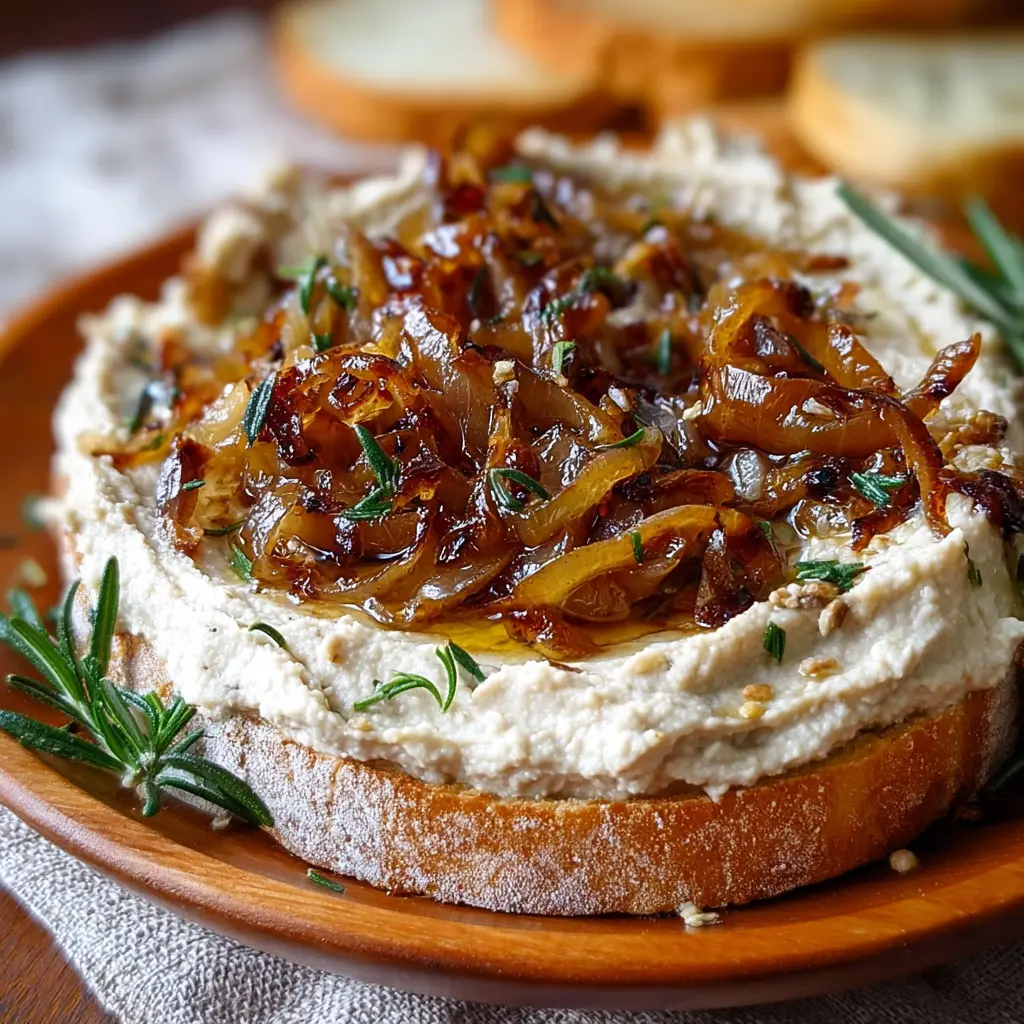 A delightful and easy appetizer featuring whipped white beans, sweet caramelized onions, and fragrant rosemary.