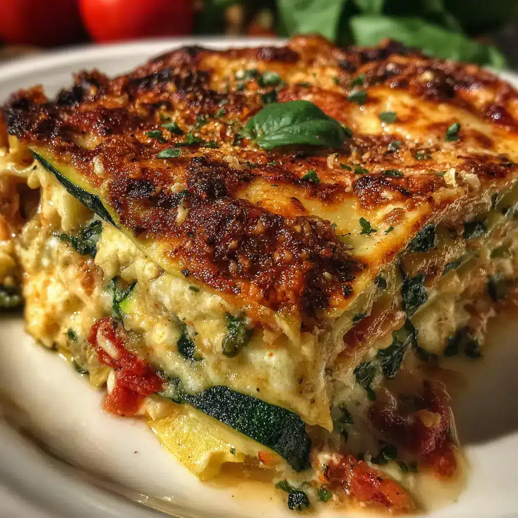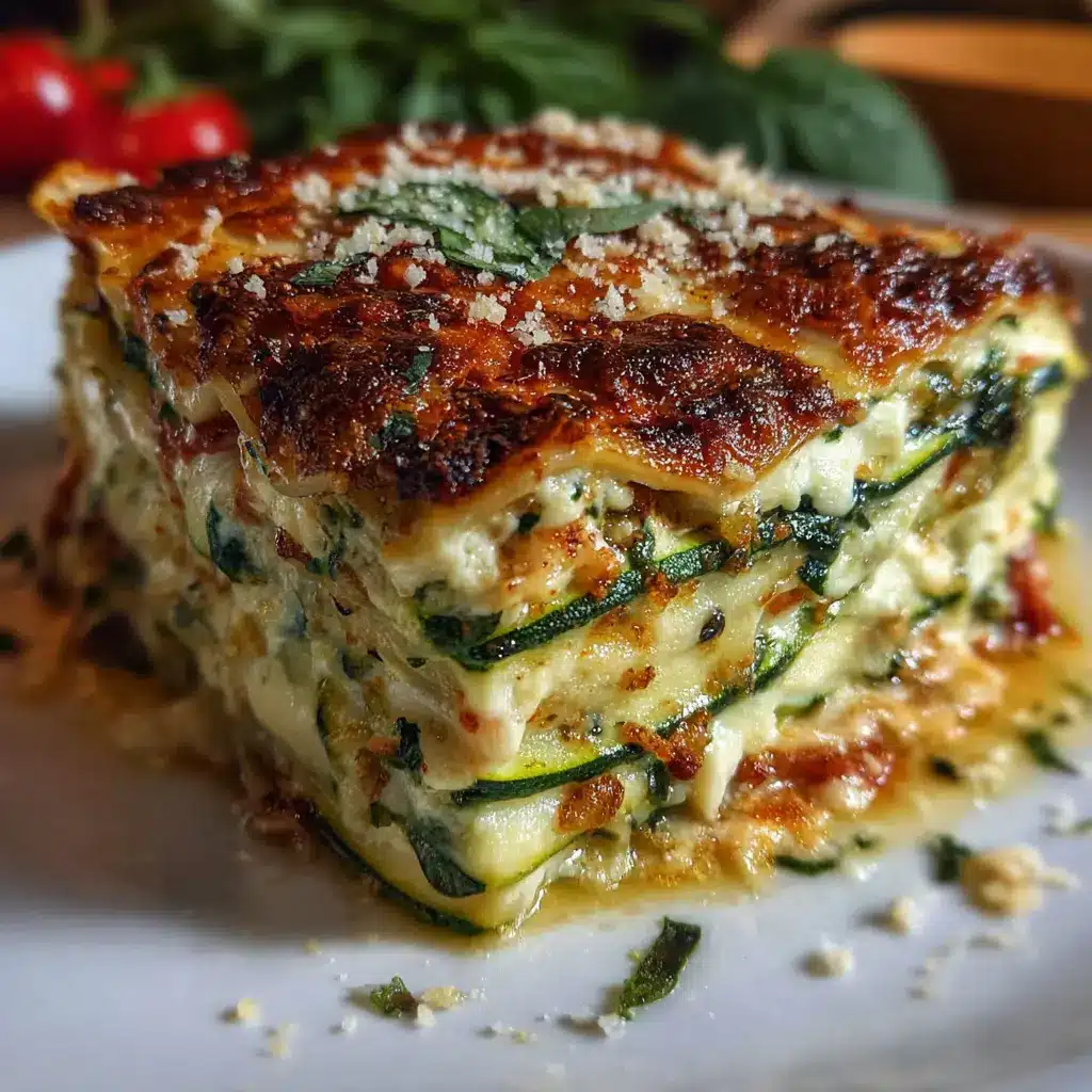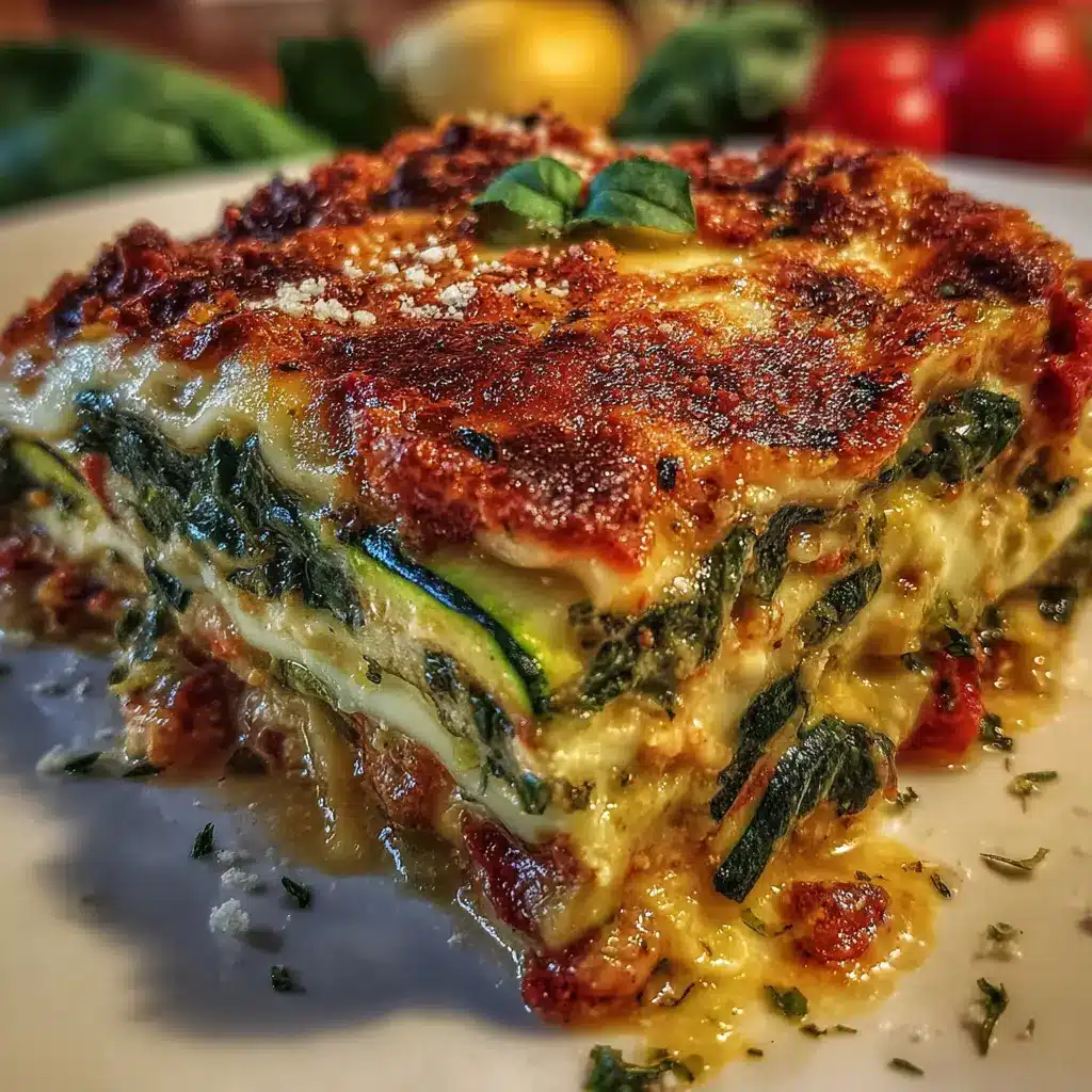 Indulge in the rich layers of zucchini, spinach, and cheese in this delightful vegetarian lasagna that brings comfort to your table.